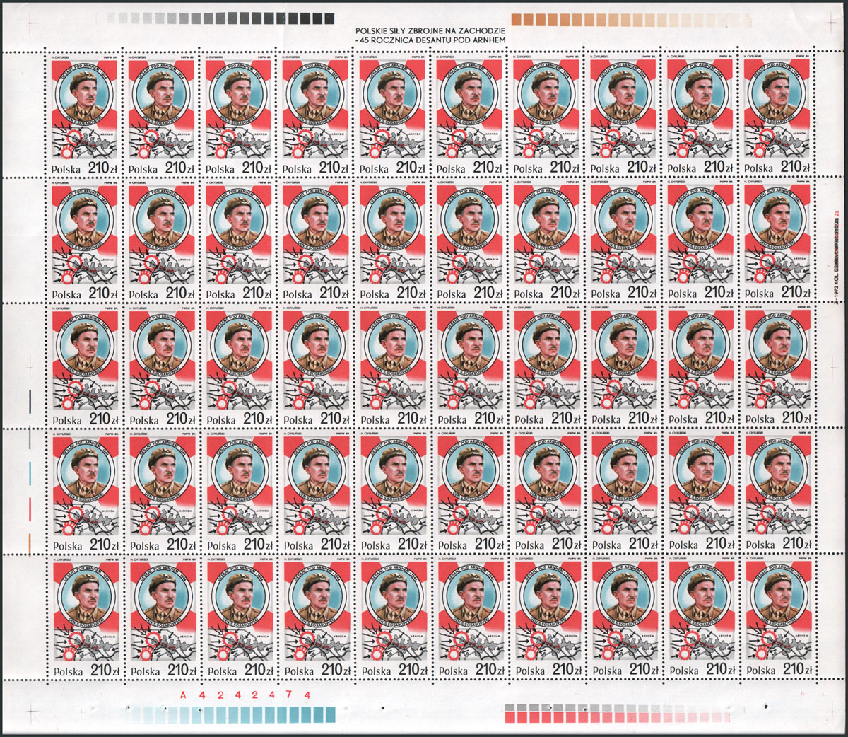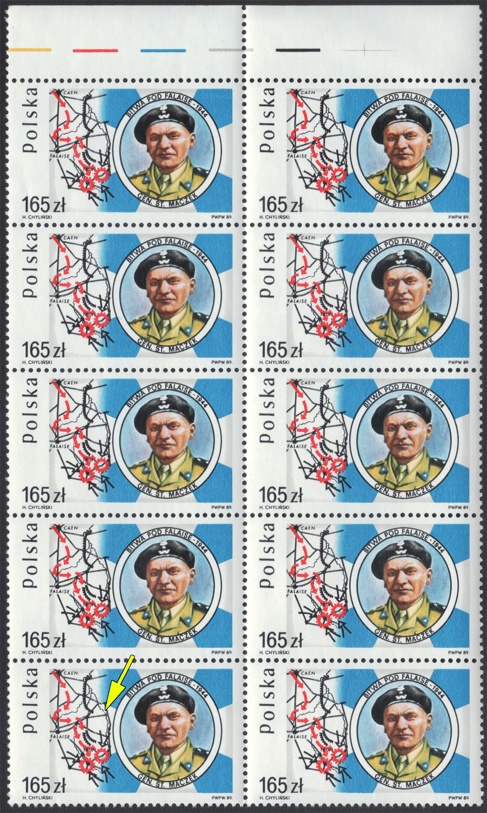 1989 45. rocznica bitwy pod Falaise, znaczki za 165 zł w 10-bloku z górnym marginesem, na poz.22 znaczek z błędem "przerwa w linii rzeki Dives"; bardzo dobry stan zachowania; gwarancja. | Fi.3065 B Mi.3213 |