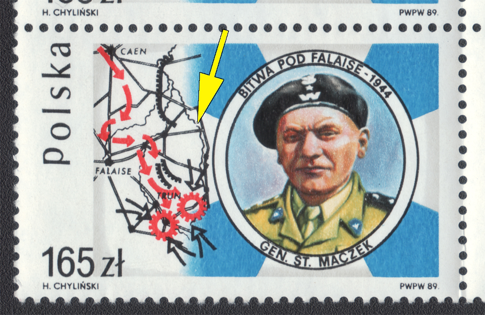 1989 45. rocznica bitwy pod Falaise, znaczek z błędem "przerwa w linii rzeki Laizon", gwarancja i opis Walocha. | Fi.3065B1 Mi.3213 |