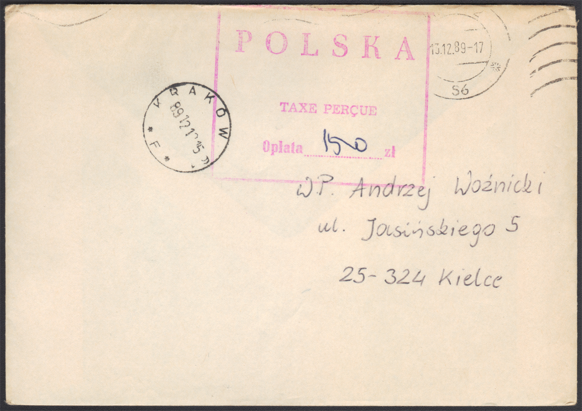 1989 "POLSKA TAXE PERCUE Opłata ... zł" - koperta ze stemplem opłaty gotówkowej z dopisaną jej wysokością "1,50" wysłana 13.12 z Krakowa do Kielc; bardzo dobry stan zachowania. | |