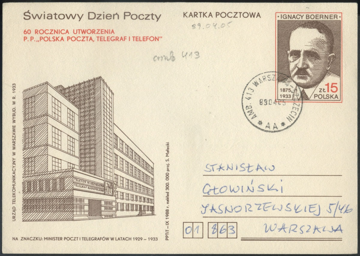 1989 kartka nadana w ambulansie pocztowym na trasie Warszawa - Szczecin nr 413. | Fi.Cp985 |