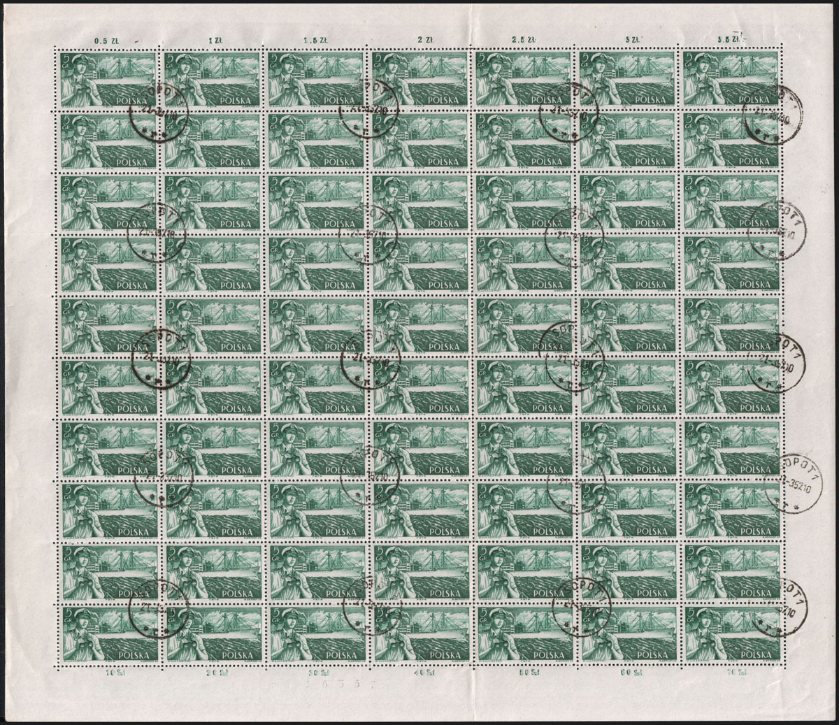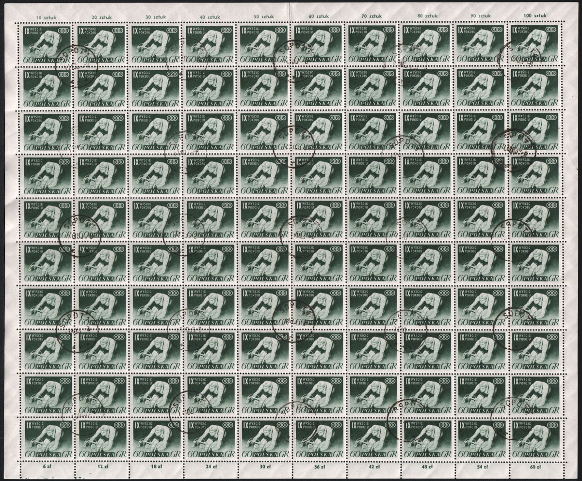 1956 IX Wyścig Pokoju, stemplowany arkusz sprzedażny znaczka za 60 gr. złożony w połowie. | Fi.821 ark. Mi.965 |
