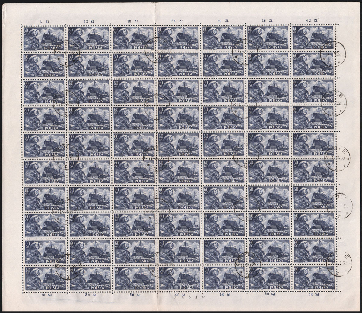 1956 Statki polskie, stemplowany arkusz znaczka za 60 gr. złożony w połowie. | Fi.819 ark. Mi.963 |