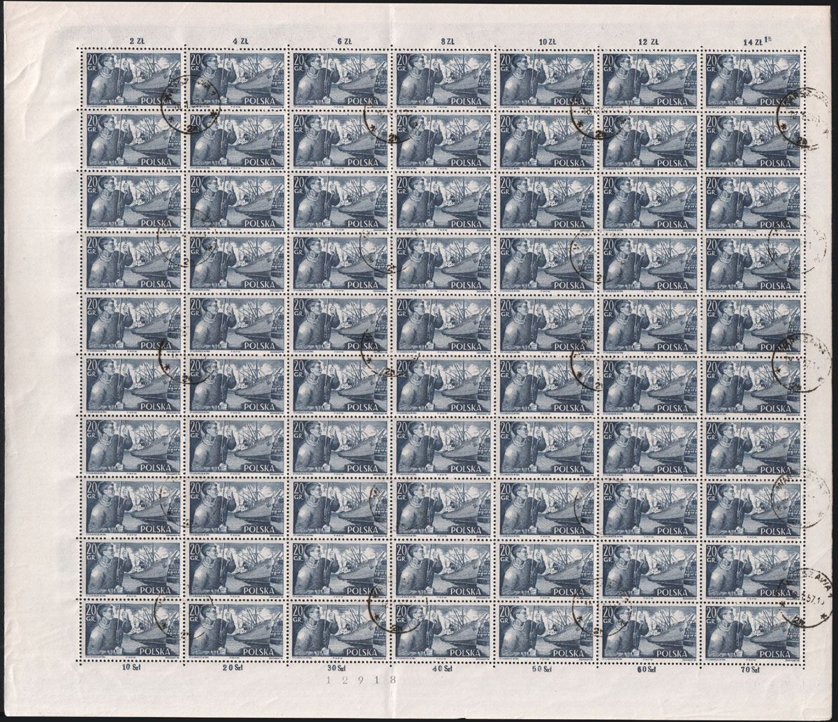 1956 Statki polskie, stemplowany arkusz znaczka za 20 gr. złożony w połowie. | Fi.817 ark. Mi.961 |