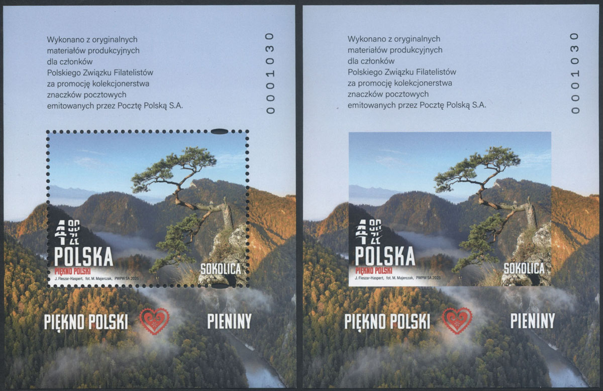 2025 piękno Polski - Sokolica Pieniny, bloczki beznominałowe wykonane przez PWPW dla członków PZF na promocje kolekcjonerstwa w nakładzie po 4000 sztuk. | Fi.5445ND A, B |