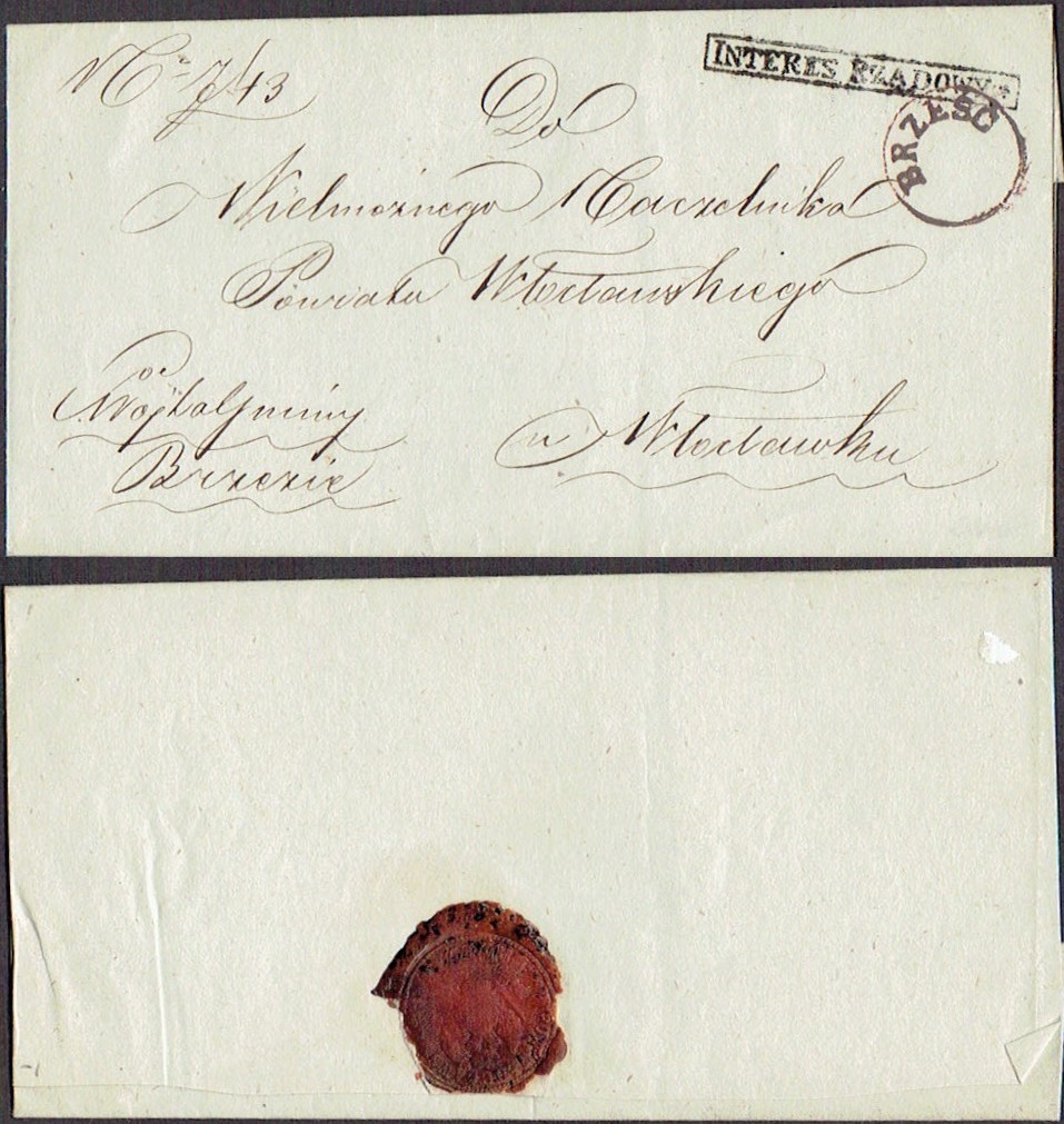 1855 około, Brześć (Kujawski), obwoluta listu wysłanego z Brześcia do Włocławka, stempel nadawczy typu IIIA, dodatkowo stempelek "Interes Rządowy" oznaczający, że list jest zwolniony z opłaty pocztowej, z tyłu obwoluty pieczęć lakowa Wójta Gminy Brzezie. | |