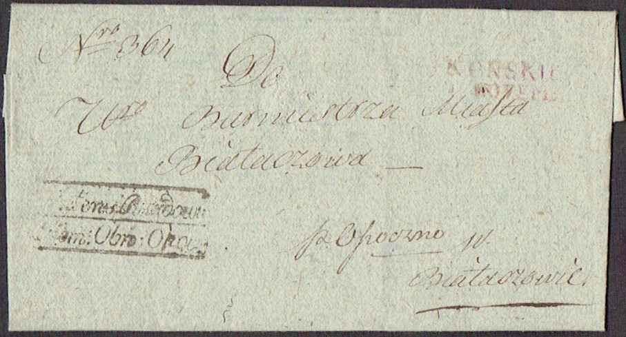 1830 około, Końskie, obwoluta listu wysłanego z miasta Końskie do miejscowości Białaczów, stempel nadawczy typu IB, dodatkowo stempelek "Interes Rządowy Kom. Obw. Opoc." oznaczający, że list jest zwolniony z opłaty pocztowej. | |