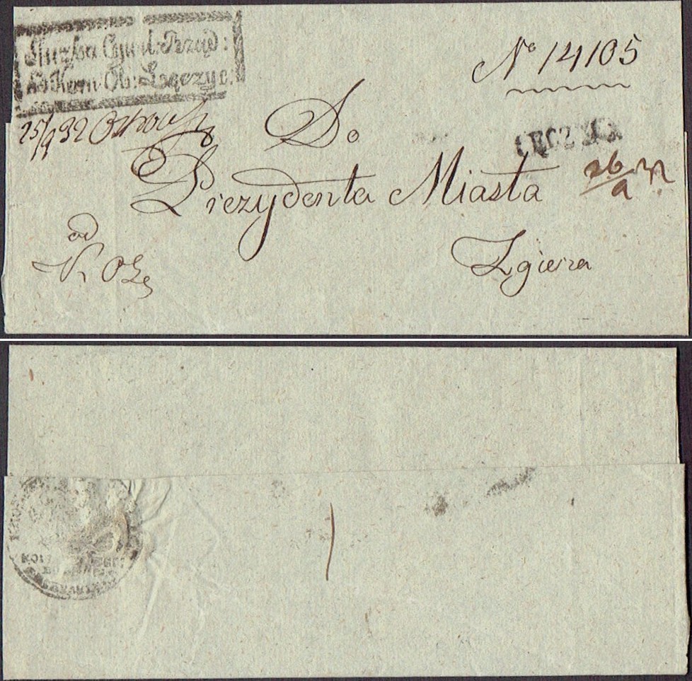 1832 Łęczyca, obwoluta listu wysłanego z Łęczycy do Zgierza, stempel nadawczy typu IIA, dodatkowo stempelek "Służba Cywil. Rząd. od Kom. Ob. Łęczyc." oznaczający, że list jest zwolniony z opłaty pocztowej, z tyłu obwoluty pieczęć. | |