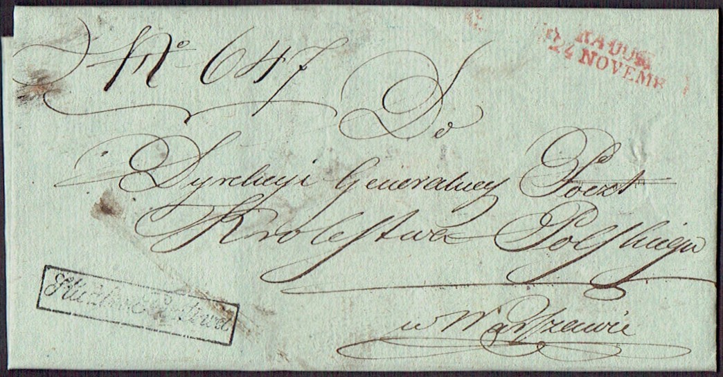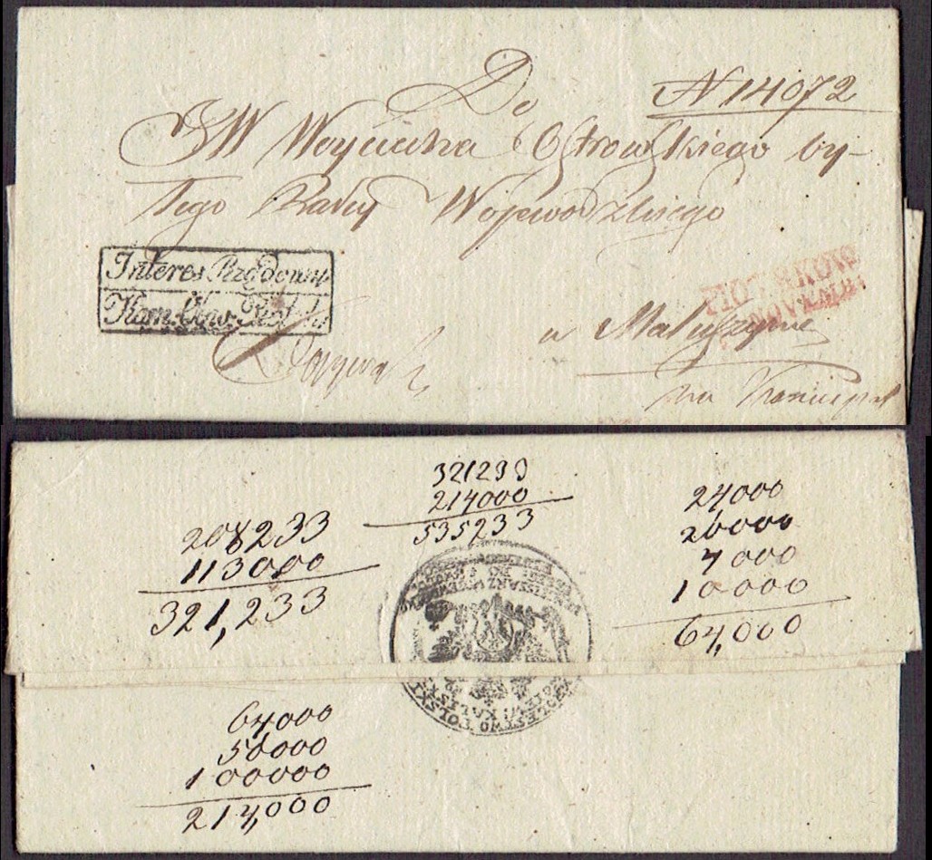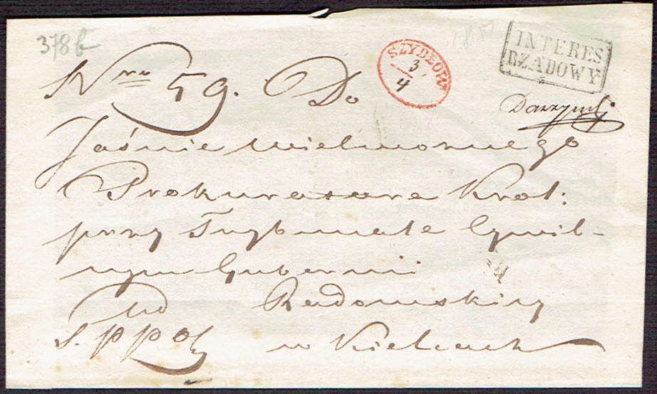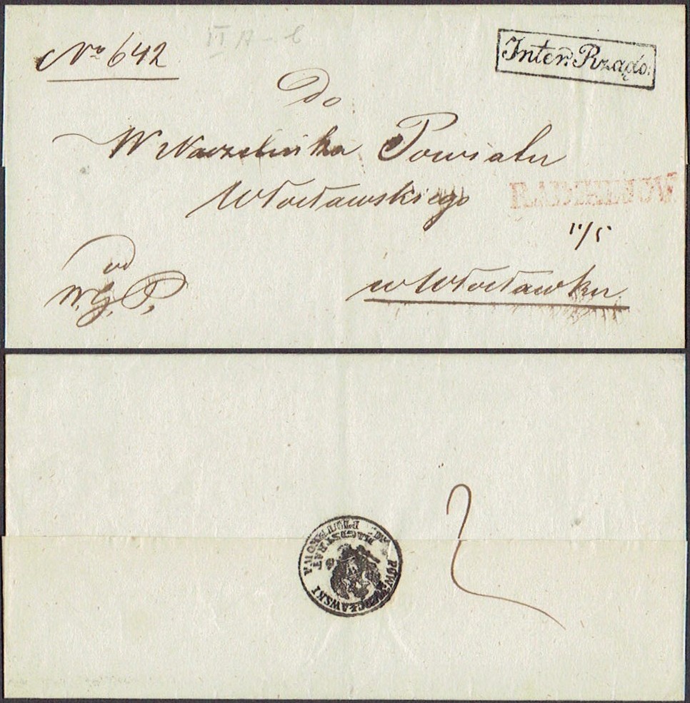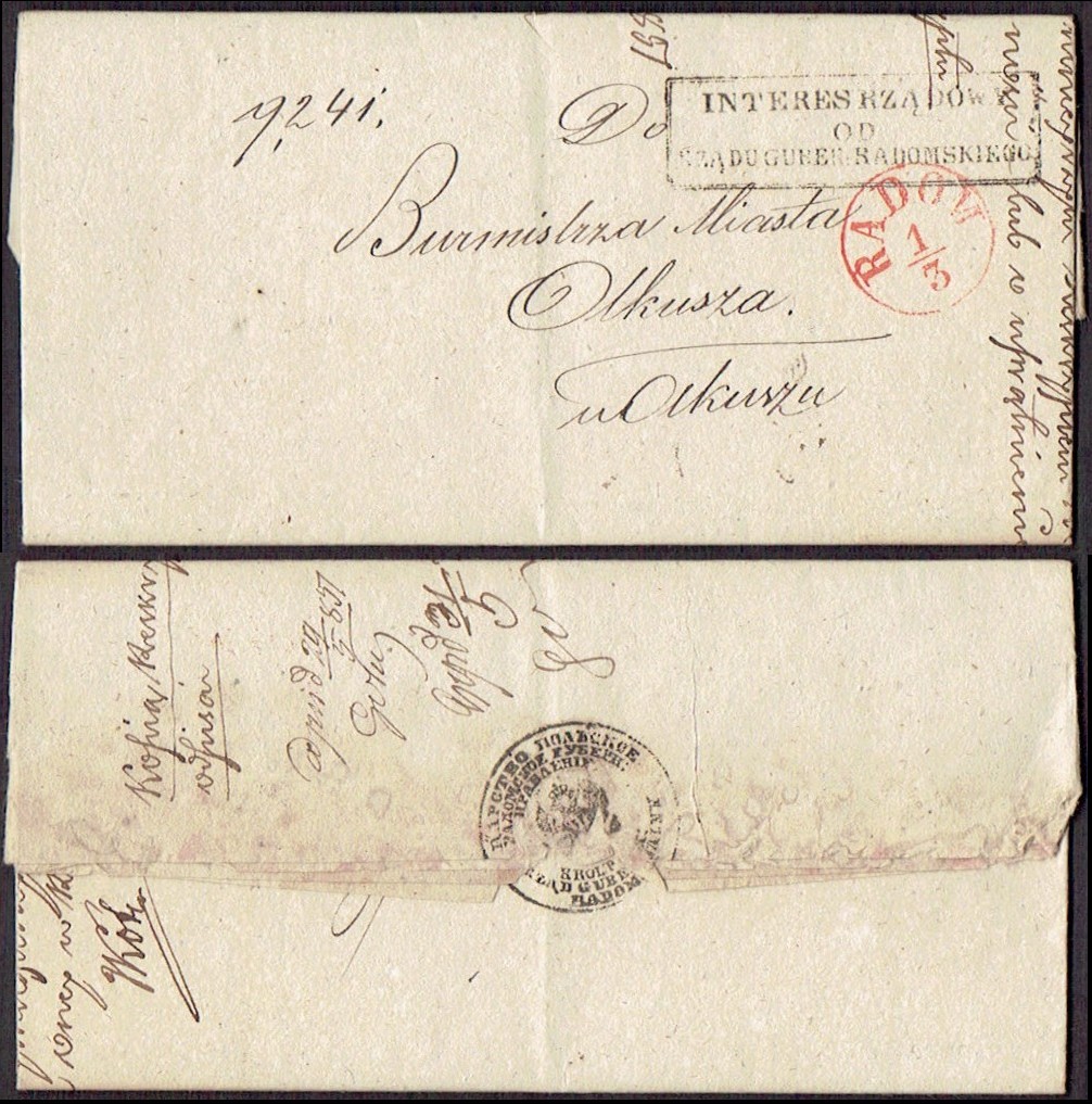 1832 około, Radom, obwoluta listu wysłanego z Radomia do Dyrekcji Generalnej Królestwa Polskiego w Warszawie, stempel nadawczy typu IB, dodatkowo stempelek "Interes Pocztowy" oznaczający, że list jest zwolniony z opłaty pocztowej. | |