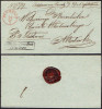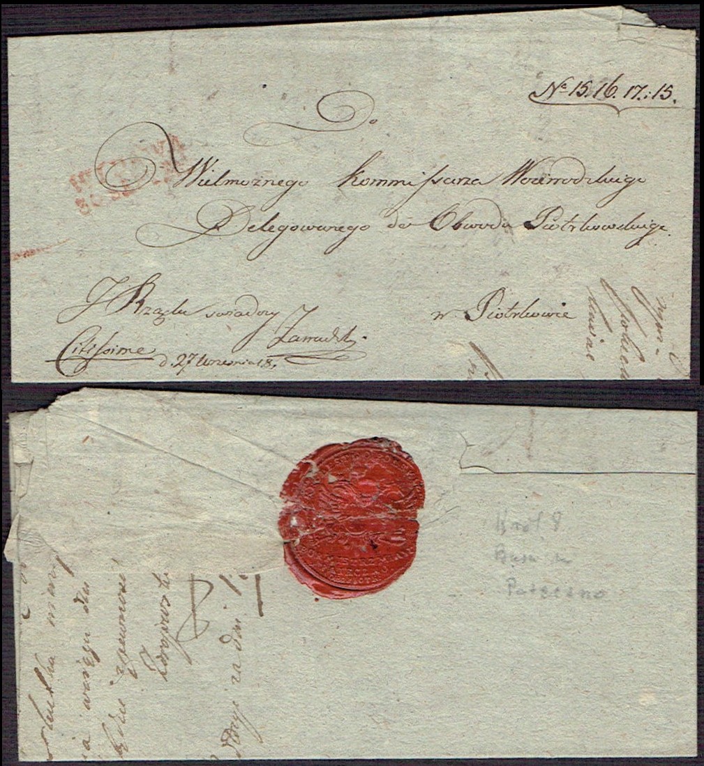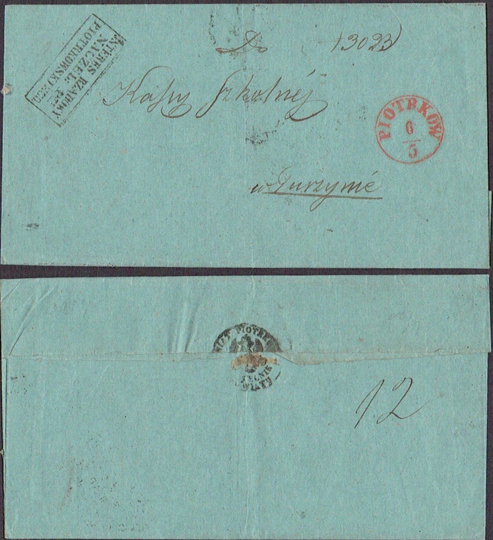 1833 Piotrków, kompletny list składany wysłany z Piotrkowa do Maluszyna, stempel nadawczy typu IB, dodatkowo stempelek "Interes Rządowy Kom. Obw. Piotrk." oznaczający, że list jest zwolniony z opłaty pocztowej, z tyłu obwoluty pieczęć. | |