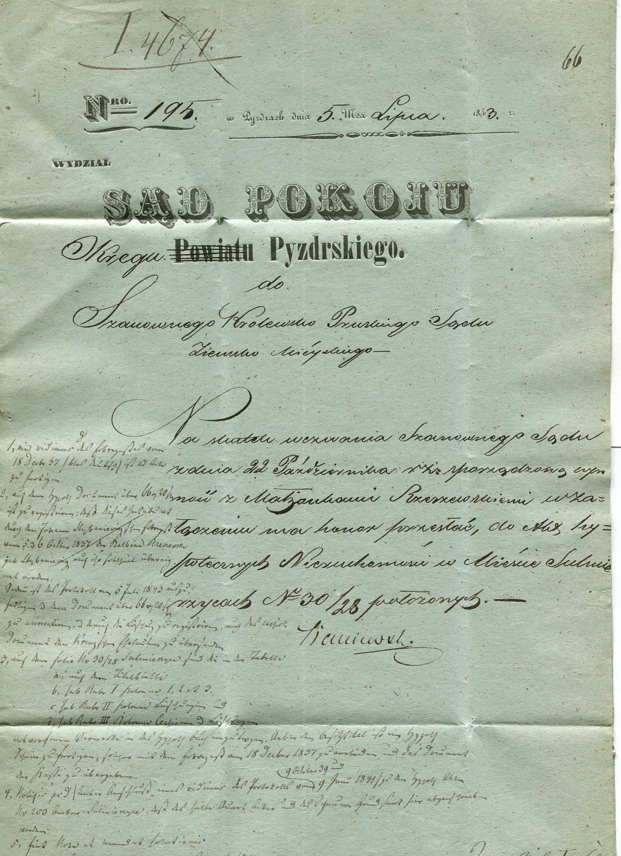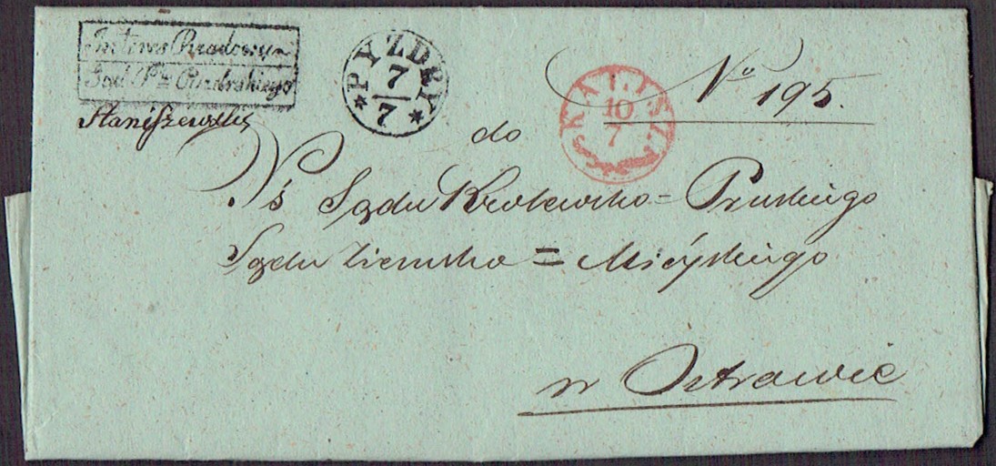 1843 Pyzdry, kompletny list składany wysłany 7.07.1843 przez Sąd Pokoju w Pyzdrach do Ostrowa, stempel nadawczy typu IIID, stempel tranzytowy Kalisza, dodatkowo stempelek "Interes Rządowy Sąd Pow. Pyzdrskiego" oznaczający, że list jest zwolniony z opłaty pocztowej, treść listu napisana na papierze firmowym. | |