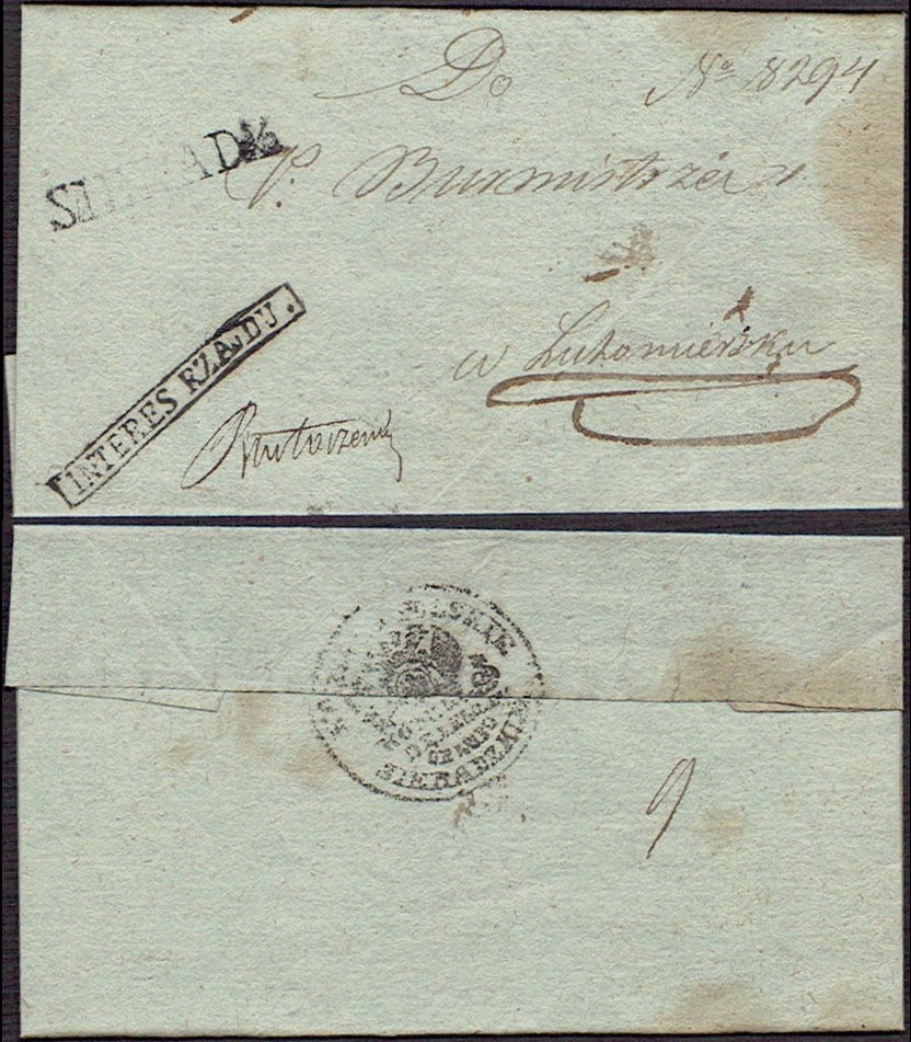 1830 około, Sieradz, obwoluta listu wysłanego z Sieradza do Lutomierska, stempel nadawczy typu IIA, dodatkowo stempelek "Interes Rządu" oznaczający, że list jest zwolniony z opłaty pocztowej, z tyłu obwoluty pieczęć. | |