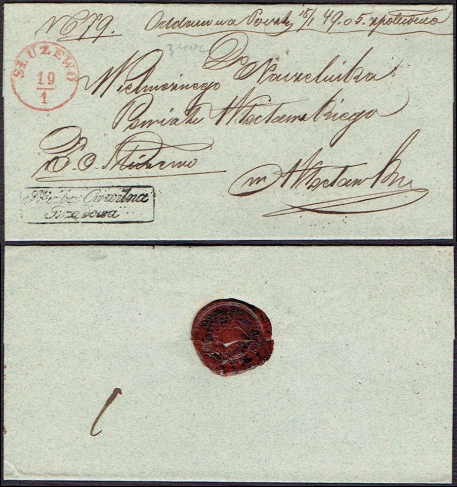 1849 Słuźewo, obwoluta listu wysłanego ze Służewa do Włocławka, stempel nadawczy typu IIIC, dodatkowo stempelek "Służba Cywilna Rządowa" oznaczający, że list jest zwolniony z opłaty pocztowej, z tyłu obwoluty dobrze zachowana pieczęć lakowa. | |