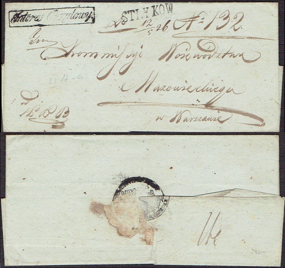 1826 Stryków, obwoluta listu wysłanego ze Strykowa do Warszawy, stempel nadawczy 35x7 typu IIA, dodatkowo stempelek "Interes Rządowy" oznaczający, że list jest zwolniony z opłaty pocztowej. | |