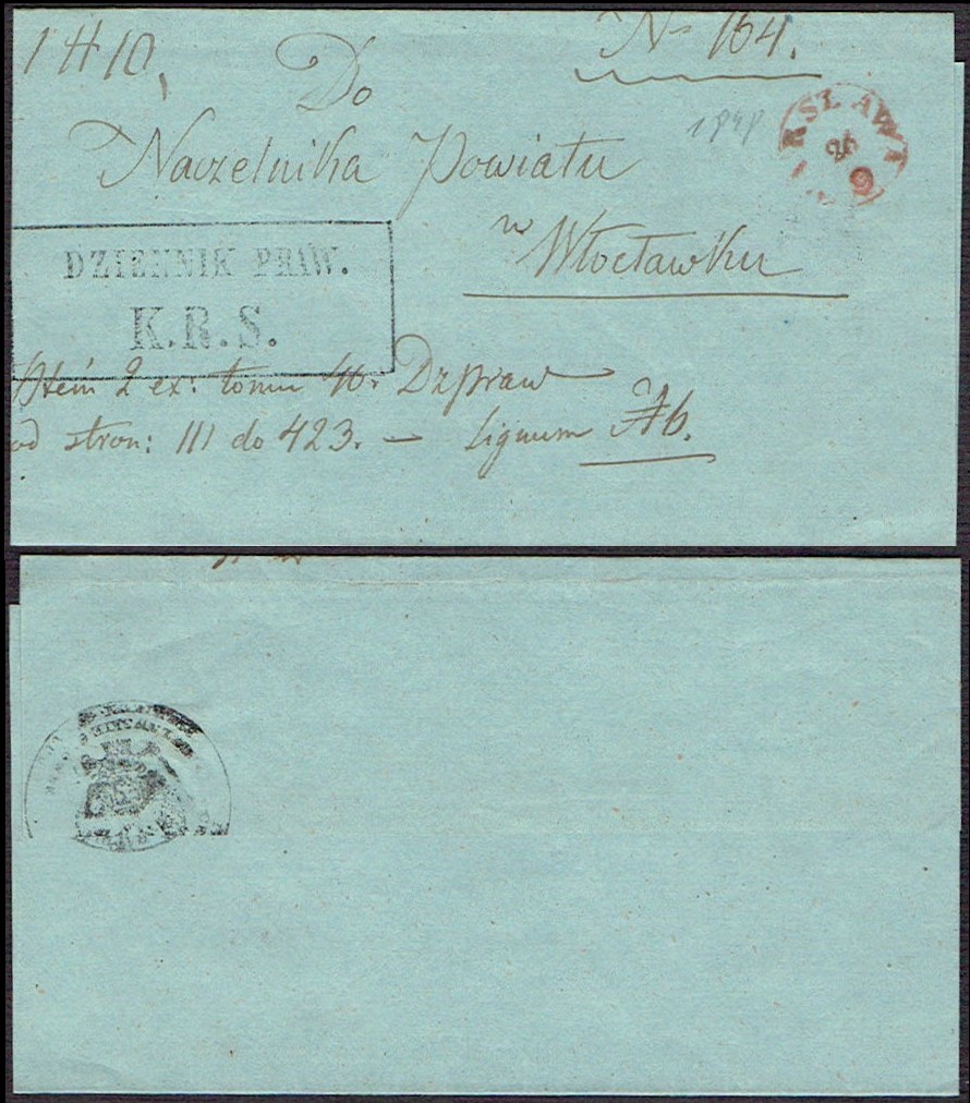 1848 Warszawa, obwoluta listu wysłanego z Warszawy do Włocławka, stempel nadawczy typu IIIC, dodatkowo stempelek "Dziennik Praw K.R.S." oznaczający, że list jest zwolniony z opłaty pocztowej, z tyłu obwoluty pieczęć. | |