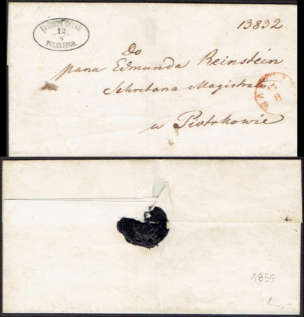 1855 Warszawa, obwoluta listu wysłanego z Warszawy do Piotrkowa, stempel nadawczy typu IIIC, dodatkowo stempelek "Interes Banku Polskiego" oznaczający, że list jest zwolniony z opłaty pocztowej, z tyłu obwoluty pieczęć lakowa. | |