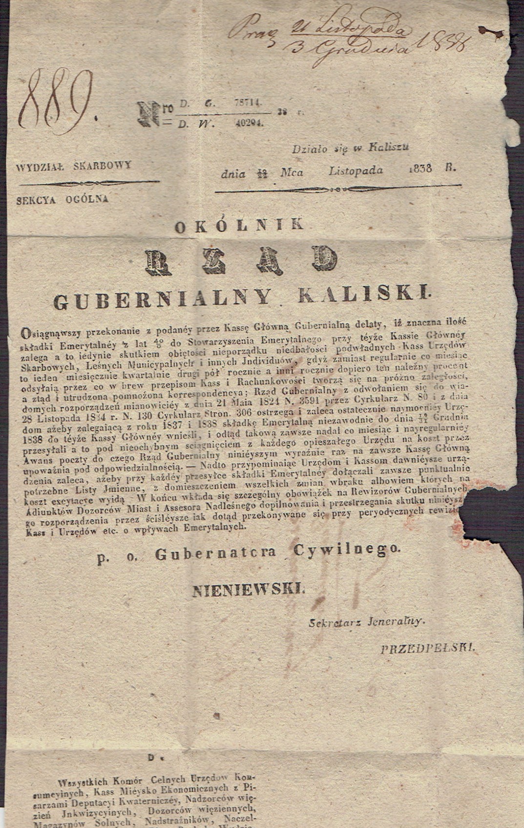 1838 Kalisz, kompletny list składany wysłany z Kalisza do Tuszynu, stempel nadawczy typu IIID, dodatkowo stempelek "Interes Rządowy" oznaczający, że list jest zwolniony z opłaty pocztowej, treścią listu jest Okólnik Rządu Gubernialnego Kaliskiego. | |