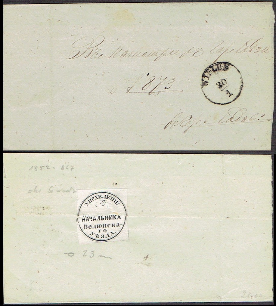 1854 obszar I Rzeczypospolitej - LUCYN, rosyjska koperta za 10+1 kop. wydania z 1849 roku, o wymiarach 138x107mm, ze znakiem wodnym Wz.I w położeniu lustrzanym, wysłana z Lucyna do Rygi; znak opłaty kreślony ręcznie, na odwrocie rzadki dobrze notowany u Dobina (5000-6000 rub) stempel nadawczy ЛЮЦИНЪ / 27 НОЯБРЯ 1854, i ryski odbiorczy ПОЛУЧЕНО / 30 НОЯБ. 1854; na zamku lucyńskim zamieszkał w 1579 roku król Stefan Batory, jego załoga liczyła 1000 żołnierzy z 50 armatami; po rozbiorze w 1772 roku Lucyn został miastem powiatowym; adresowana po polsku koperta zachowała się w bardzo dobrym stanie, piękny przykład silnych związków tych ziem z Polską, użyta w Królestwie Polskim. | Fi.Ckr4II |