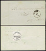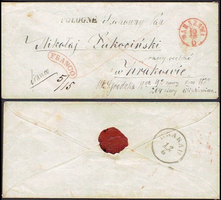 1856 około, Warszawa - koperta listu zagranicznego wysłanego z Warszawy do Krakowa, okrągły stempel nadawczy typu IIIC, stempel „Franco” i kreślenie "na krzyż" informujące o całkowitym opłaceniu listu, austriacki stempel kraju pochodzenia POLOGNE; na odwrocie datownik odbiorczy Krakau. | |