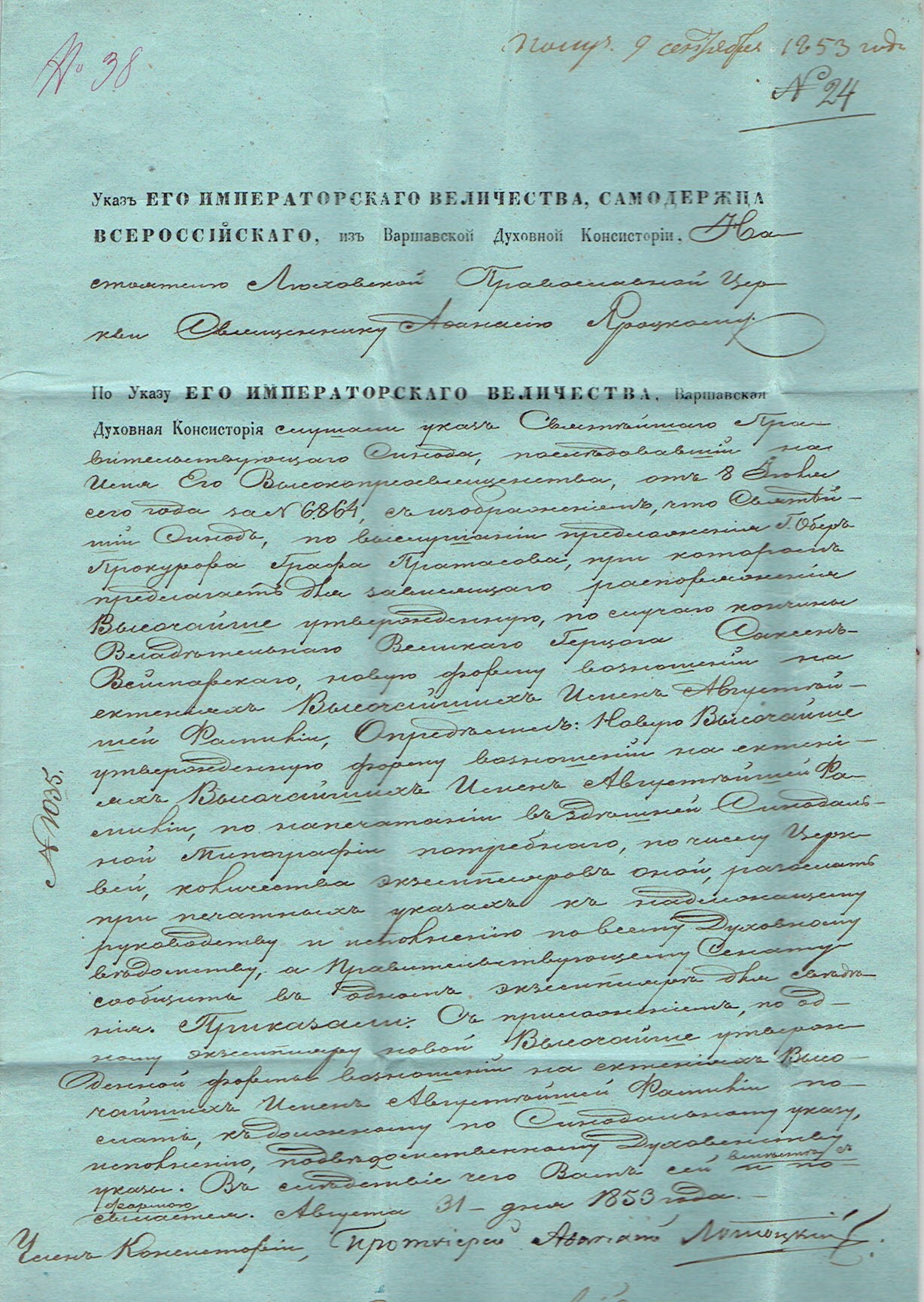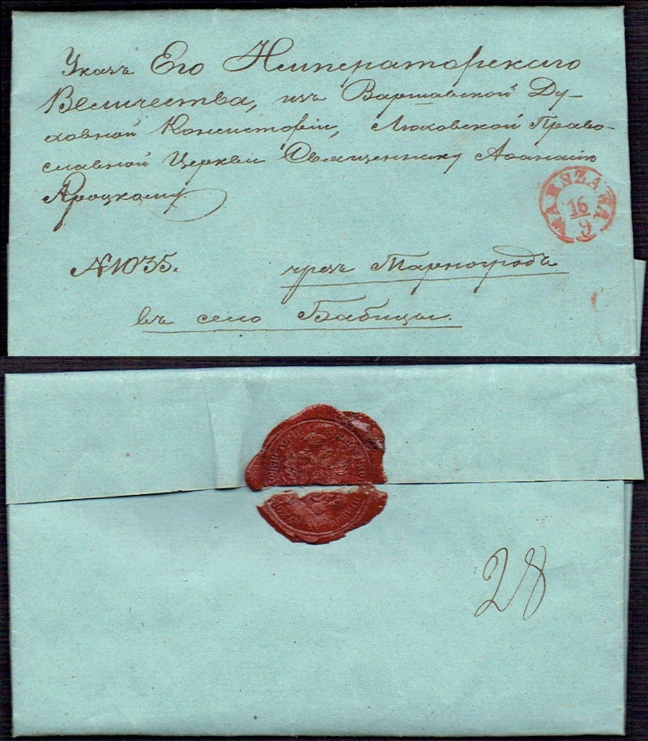 1853 Warszawa, kompletny list składany wysłany z Warszawy zawierający instrukcje Warszawskiej Duchownej Konsystorii, stempel nadawczy typu IIIC, treść listu napisana na papierze firmowym, z tyłu ładnie odciśnięta pieczęć lakowa Warszawskiej Prawosławnej Konsystorii. | |