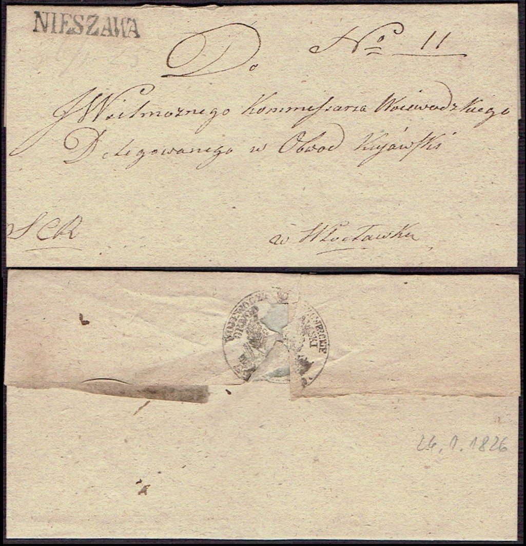 1826 Nieszawa, obwoluta listu wysłanego z Nieszawy do Włocławka, stempel nadawczy typu IIA, dodatkowo dopisane odręcznie litery "SCR" (Służba Cywilno Rządowa) oznaczające, że list jest zwolniony z opłaty pocztowej. | |