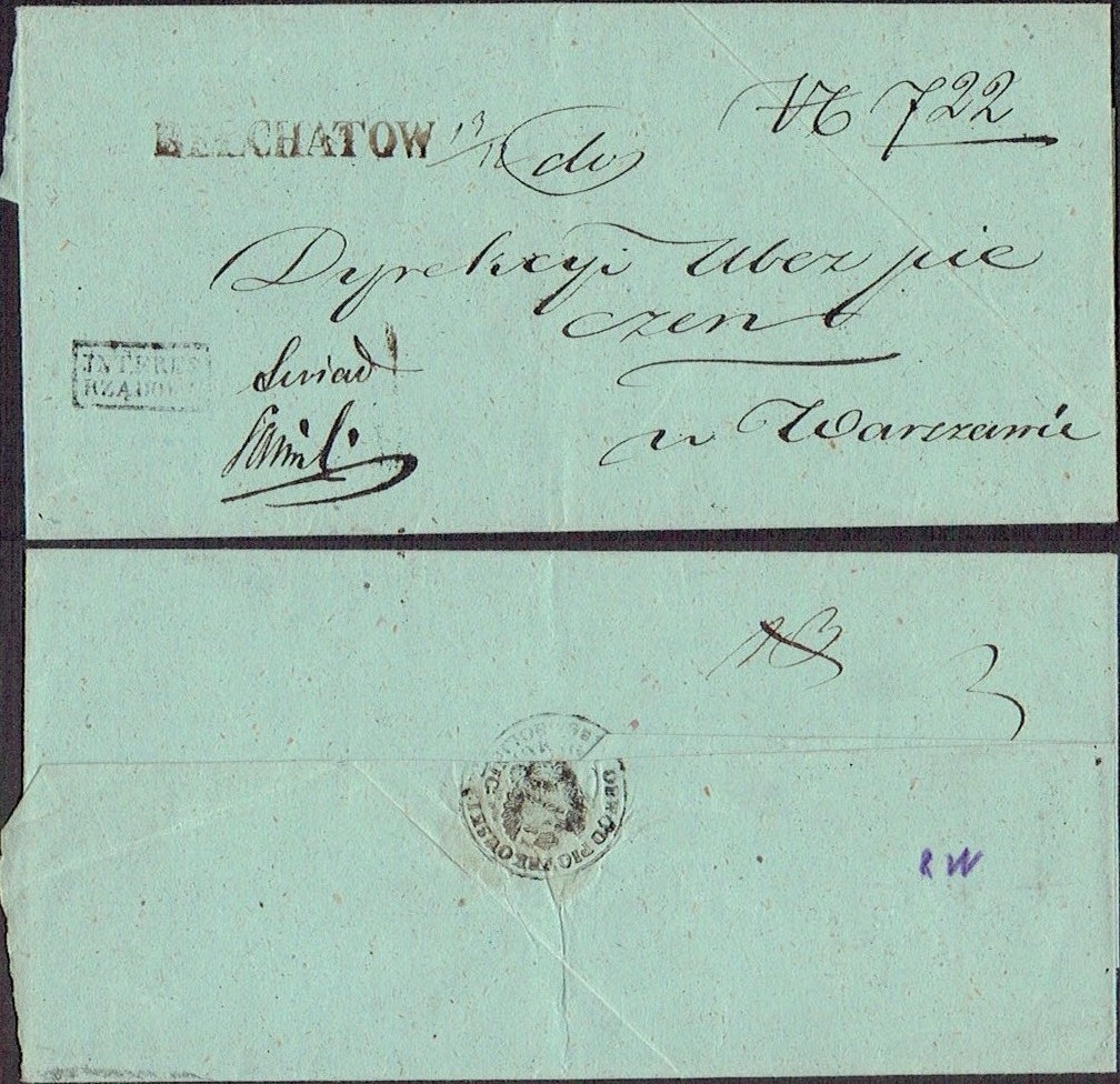 1845 około, Bełchatów, obwoluta listu wysłanego z Bełchatowa do Warszawy, stempel nadawczy typu IIA, dodatkowo stempelek "Interes Rządowy" oznaczający, że list jest zwolniony z opłaty pocztowej, z tyłu obwoluty pieczęć. | |
