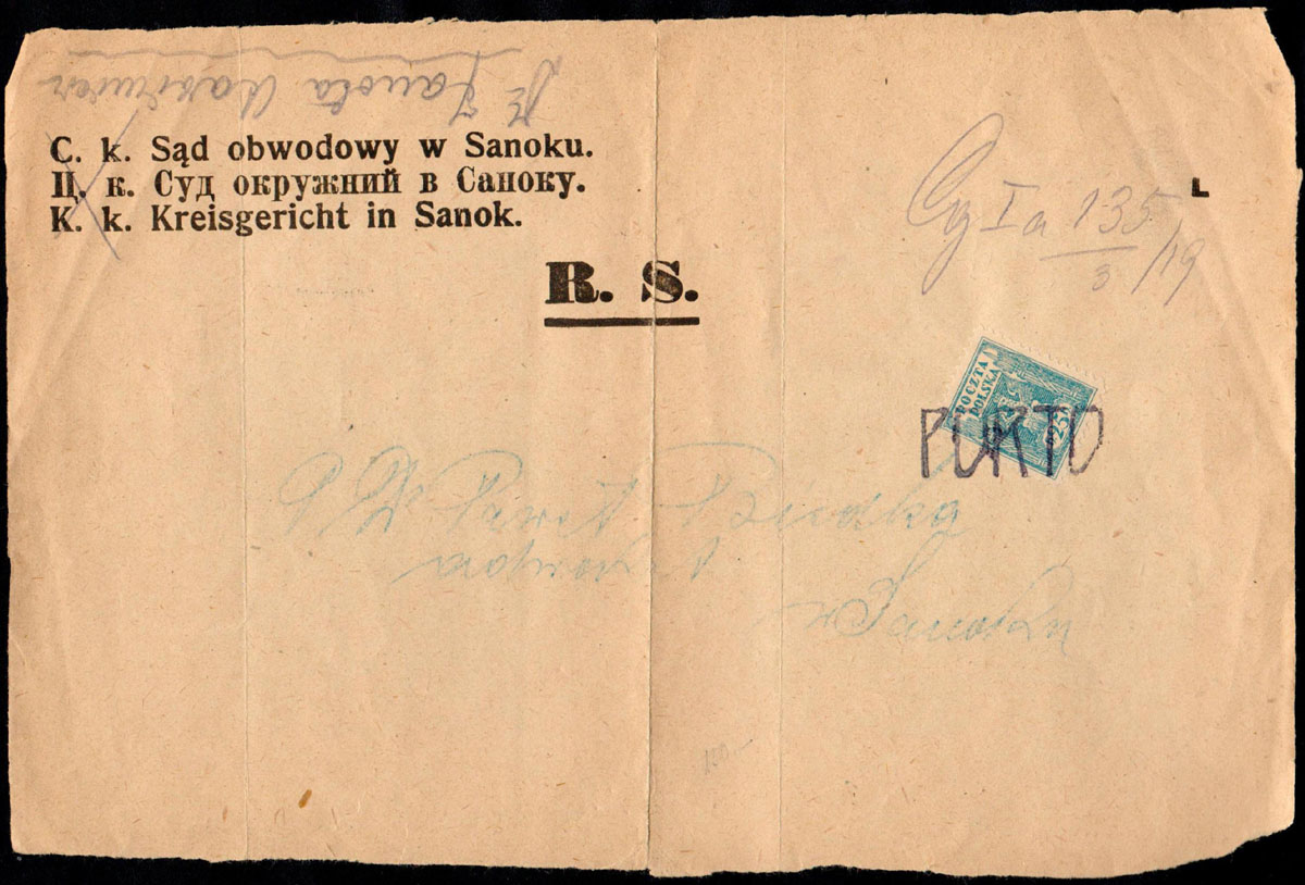 1919 porto lokalne SANOK, strona adresowa miejscowego listu sądowego z Sanoka, znaczek opłaty z lokalnym nadrukiem Porto typ 125 z Sanoka. | Fi.125 Pd26 |