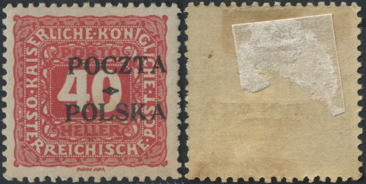 1919 wydanie krakowskie, znaczek dopłaty za 30 h. z nadrukiem formą IIA poz.6, gwarancja Danowski z sygnaturą SM i opisem Mikstein. | Fi.D7 Mi.P6 |