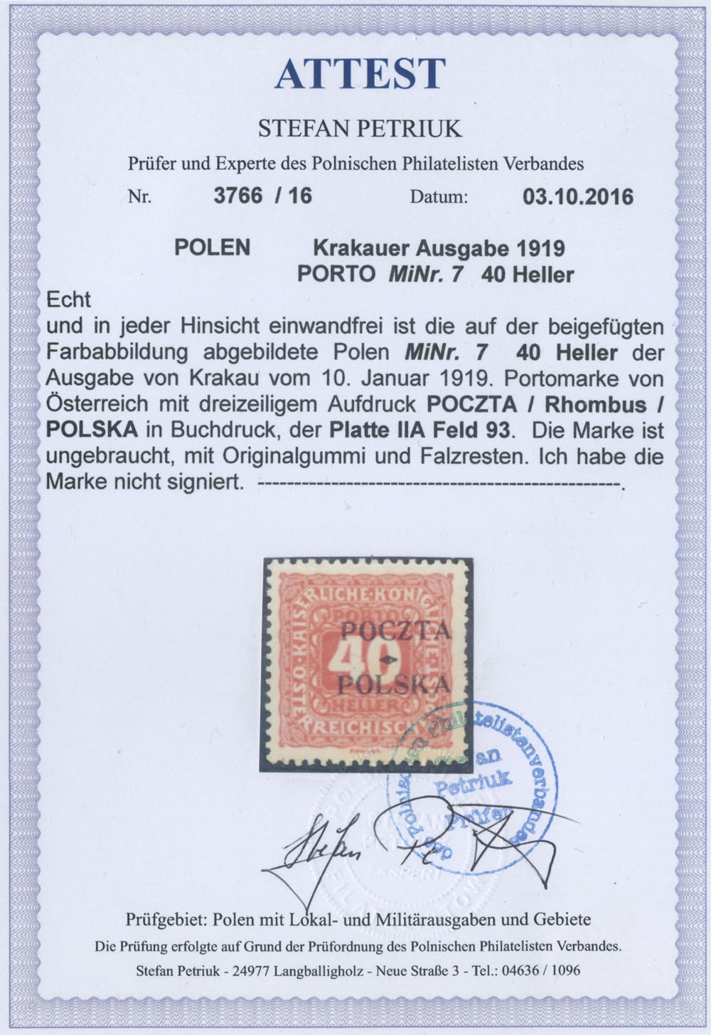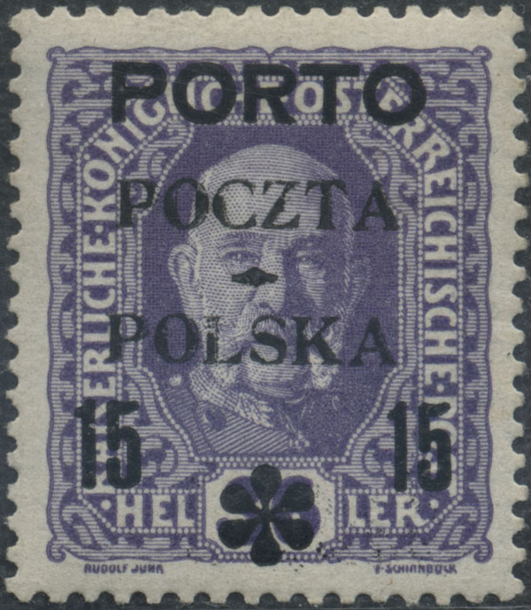 1919 wydanie krakowskie, znaczek dopłaty za 15 h. z nadrukiem formą IID z błędem na poz.21(71) "uszkodzone P w POLSKA", gwarancja Mikstein, Gryżewski, z opisem pozycji Krawczyk. | Fi.D3 B |