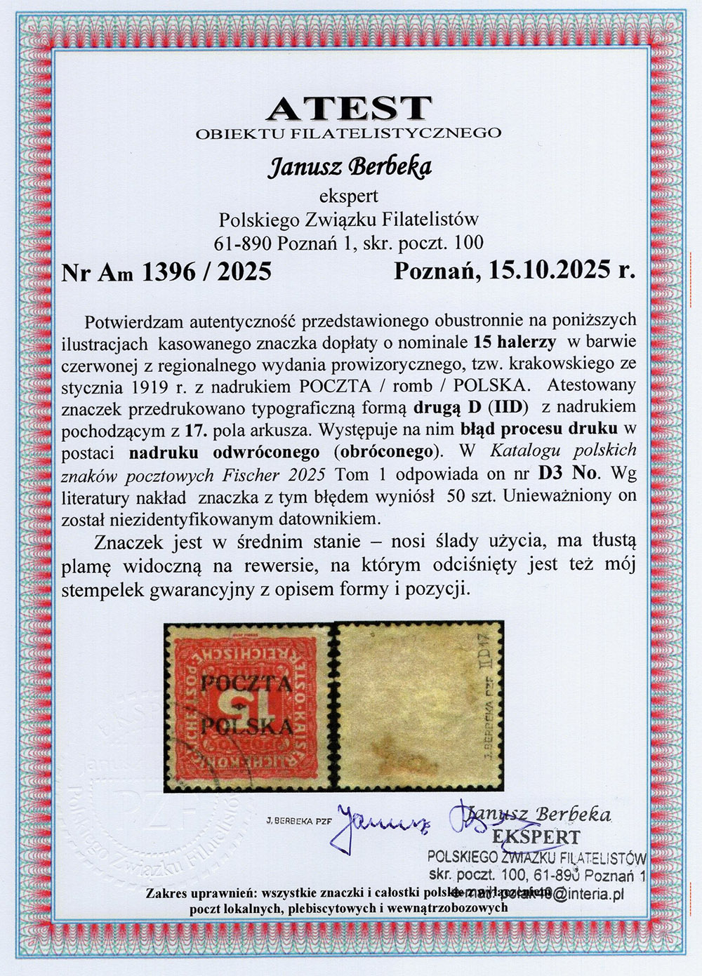 1919 wydanie krakowskie, znaczek z bardzo rzadkim nadrukiem odwróconym formy IID z poz. 17 z obiegu pocztowego z Krakowa, przedrukowano do 200 sztuk znaczków tego nominału z nadrukiem odwróconym, ponieważ zostały w większości zużyte w obiegu pocztowym tylko niewielka ilość przetrwała do dzisiaj, fotoatest Berbeka. | Fi.D3No |