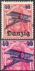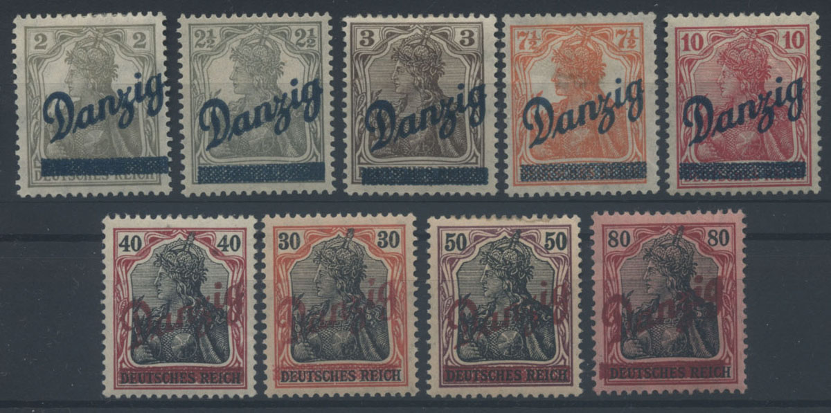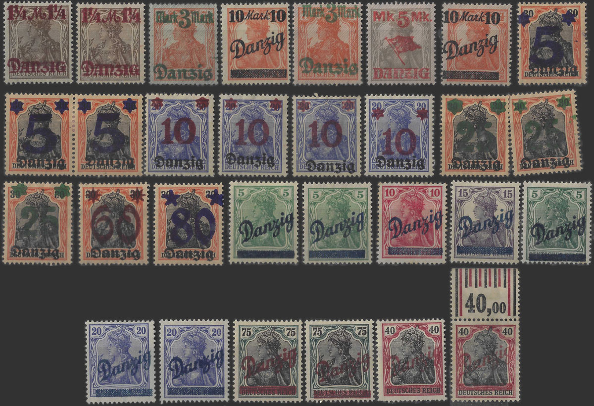 1920 wydanie prowizoryczne, środkowy znaczek z błędem przecinek przed Danzig", znaczek z prawej z błędem "gwóźdź przed Danzig".