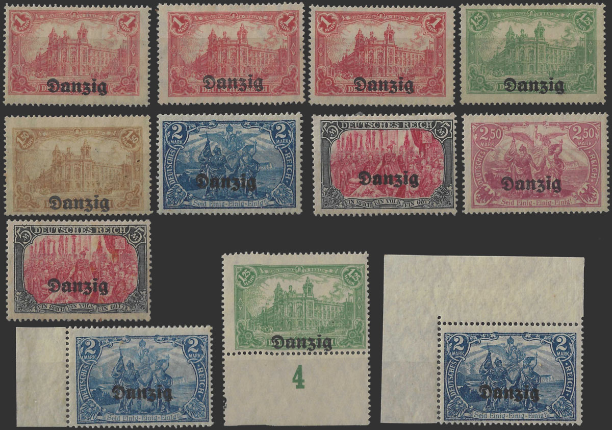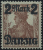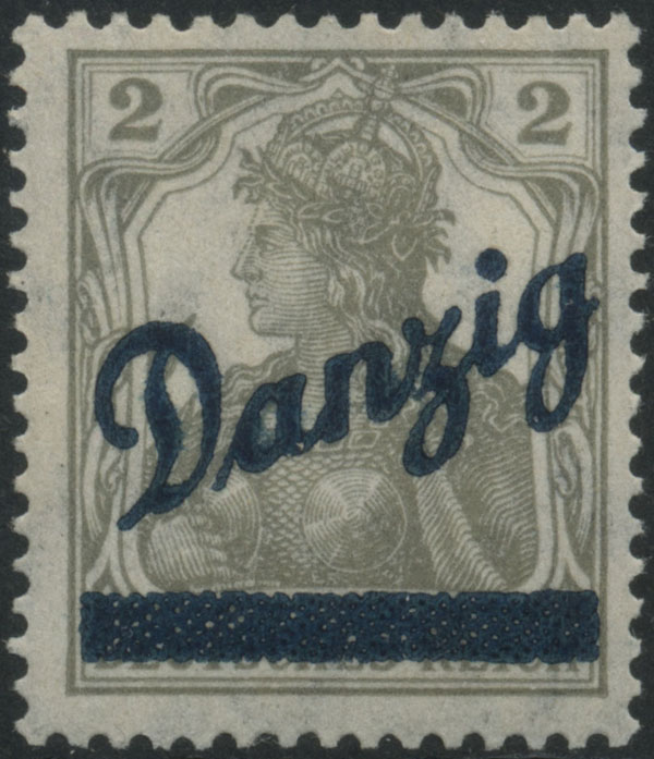 1920 wydanie prowizoryczne tzw. mały Innendienst, bardzo rzadka próba koloru nadruku - "Danzig / belka" odbito w barwie ciemno różowoczerwonej na znaczku za 2 fen., nieliczne egzemplarze skasowano - tu datownik DANZIG *2a (Fi.7000.-); ostatecznie do obiegu wprowadzono znaczek z nadrukiem w kolorze ciemno fioletowoultramarynowym, nowy fotoatest Bock BPP.