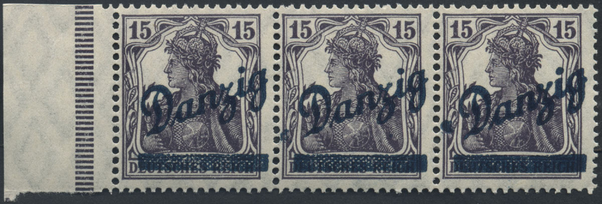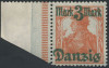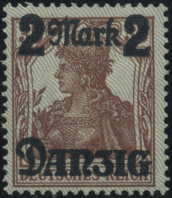 1920 wydanie przedrukowe, marginesowy znaczek za 1 Mk. z nadrukiem "Danzig" z numerem HAN "H 2395 •20" znaczka podstawowego (Fi.240.-), piękny stan zachowania.