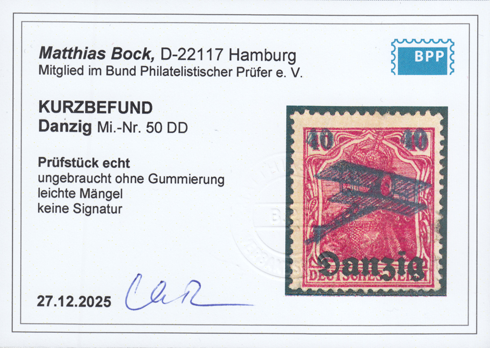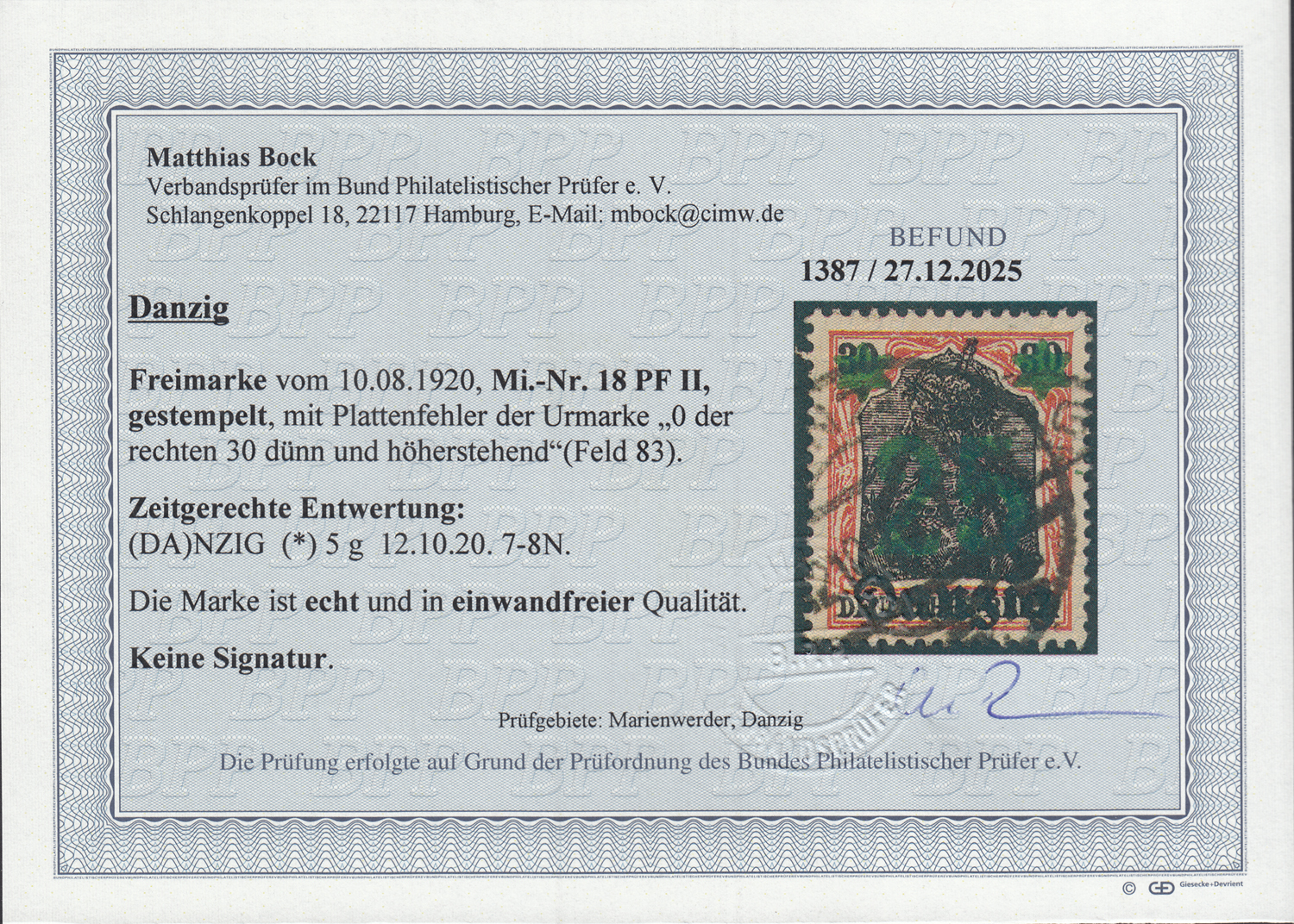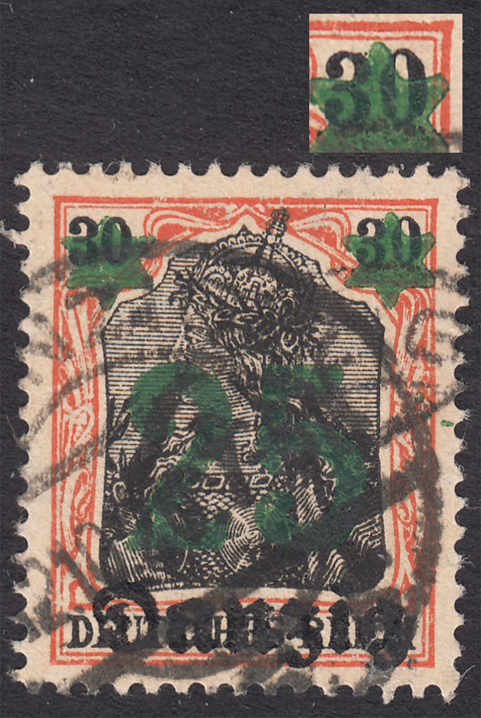 1920 wydanie prowizoryczne, oryginalnie kasowany znaczek za 25/30 Pf z rzadkim błędem na znaczku podstawowym poz.83 "cyfra 0 w prawej 30 cienka na łukach, podniesiona i oddalona od cyfry 3", datownik DANZIG 5g z oryginalnego obiegu pocztowego (Fi.1400.-); bardzo dobry stan zachowania, nowy Befund Bock.
