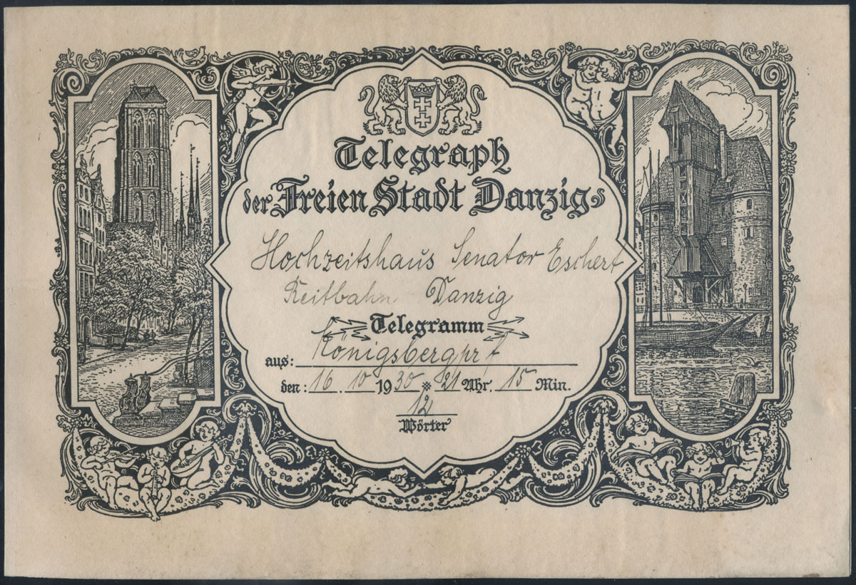 1930 ozdobny formularz telegramu do Gdańska w dobrym stanie, rozmiary 18 x 26,8 cm. | |