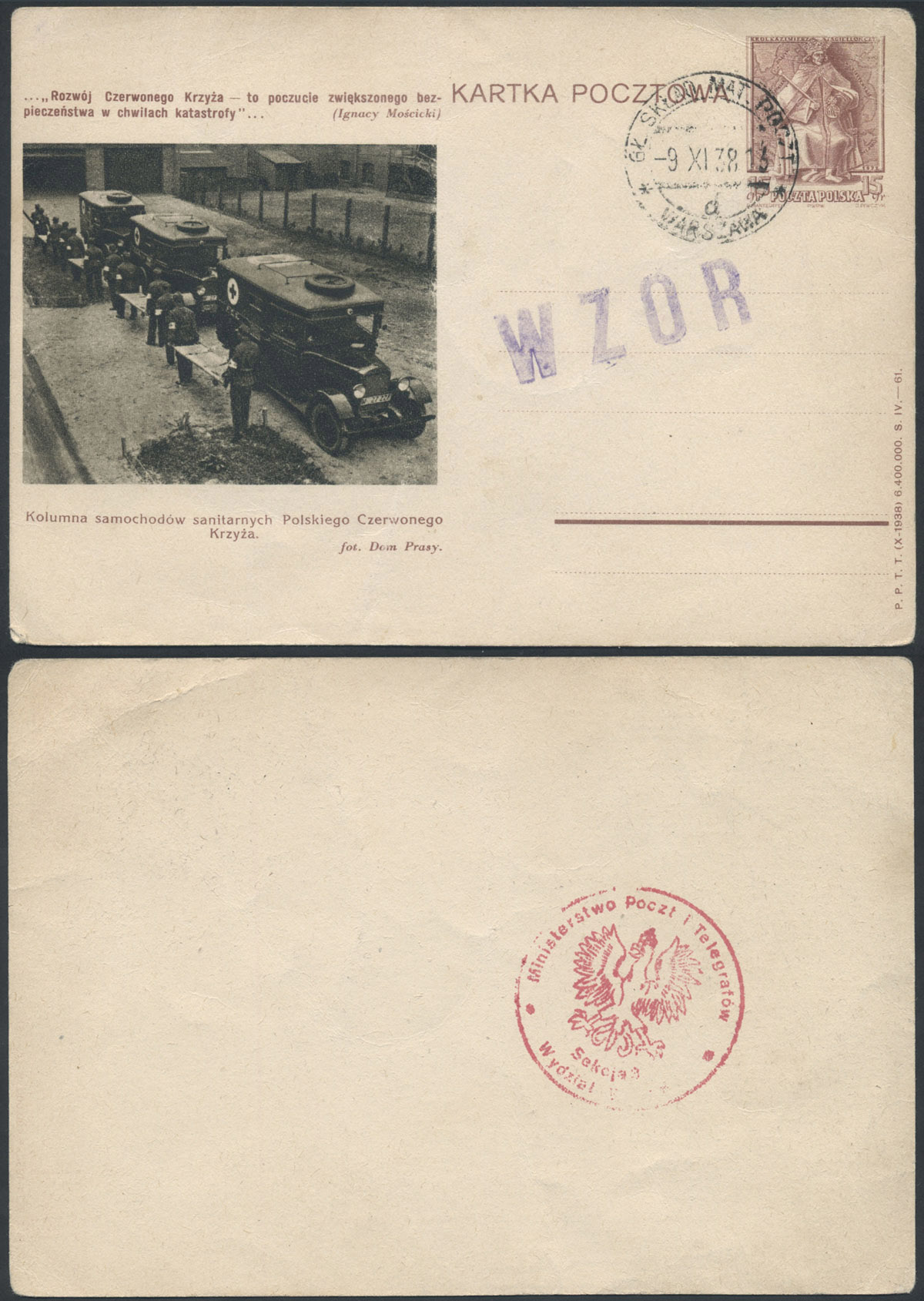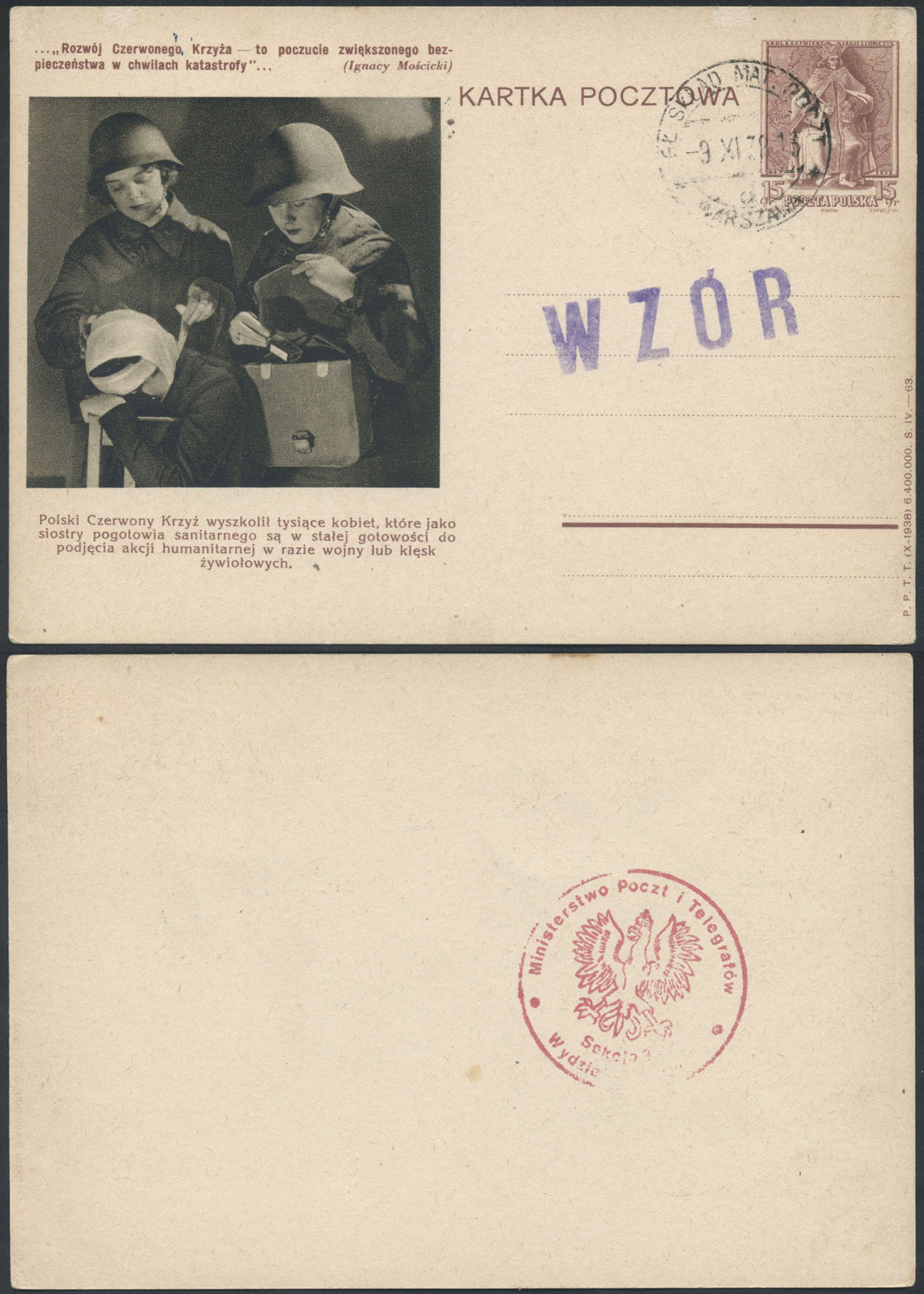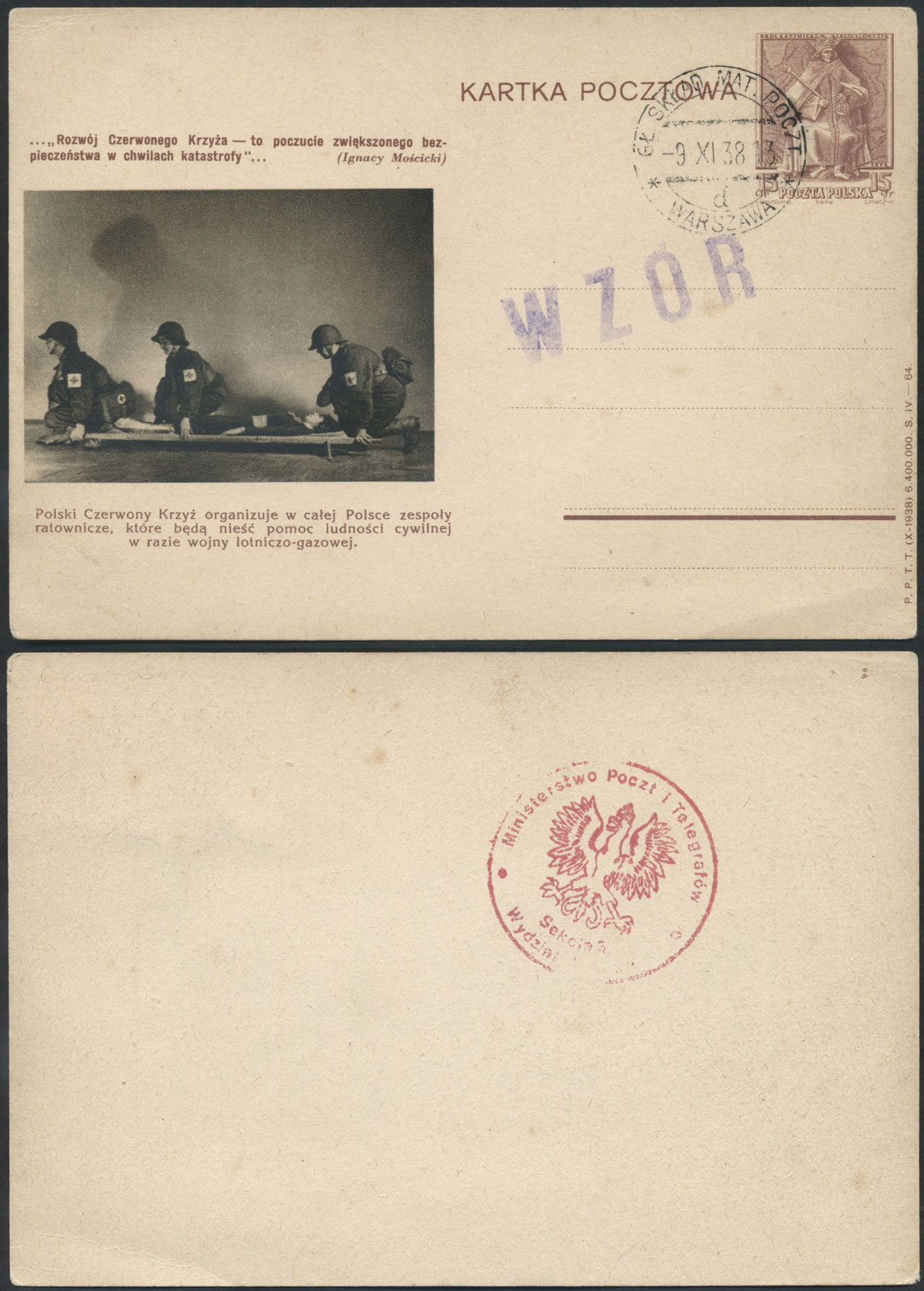 1938 król Kazimierz Jagiellończyk, egzemplarz archiwalny całostki nakładu z 1939 roku, stempel "WZÓR" oraz datownik Głównej Składnicy Materiałów Pocztowych w Warszawie z datą 9.11.38, na odwrocie stempel Ministerstwa Poczt i Telegrafów Sekcja 3 Wydział Wydań, ilustracja 63 o tematyce Polskiego czerwonego Krzyża (zwykła całostka tą ilustracją z dopłatą 500%). | Fi.Cp86 WZÓR |