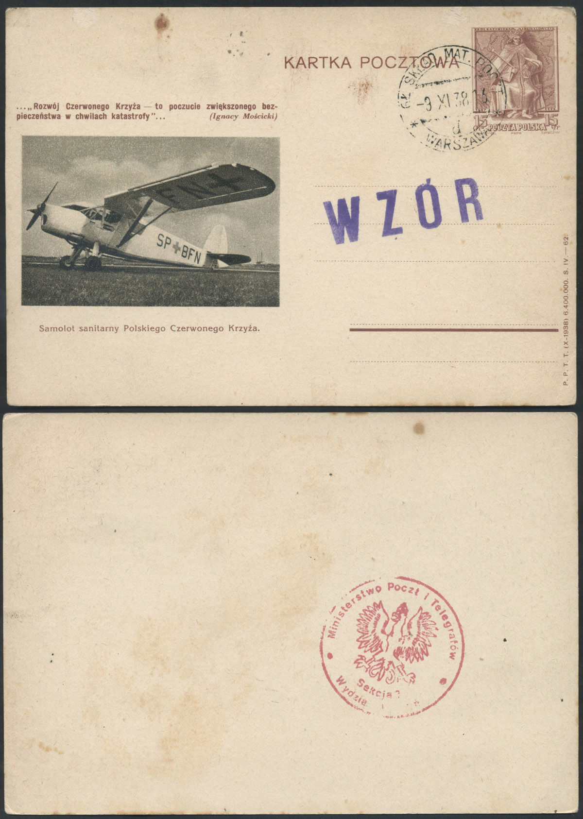 1938 król Kazimierz Jagiellończyk, egzemplarz archiwalny całostki nakładu z 1939 roku, stempel "WZÓR" oraz datownik Głównej Składnicy Materiałów Pocztowych w Warszawie z datą 9.11.38, na odwrocie stempel Ministerstwa Poczt i Telegrafów Sekcja 3 Wydział Wydań, ilustracja 62 o tematyce Polskiego czerwonego Krzyża (zwykła całostka tą ilustracją z dopłatą 500%). | Fi.Cp86 WZÓR |