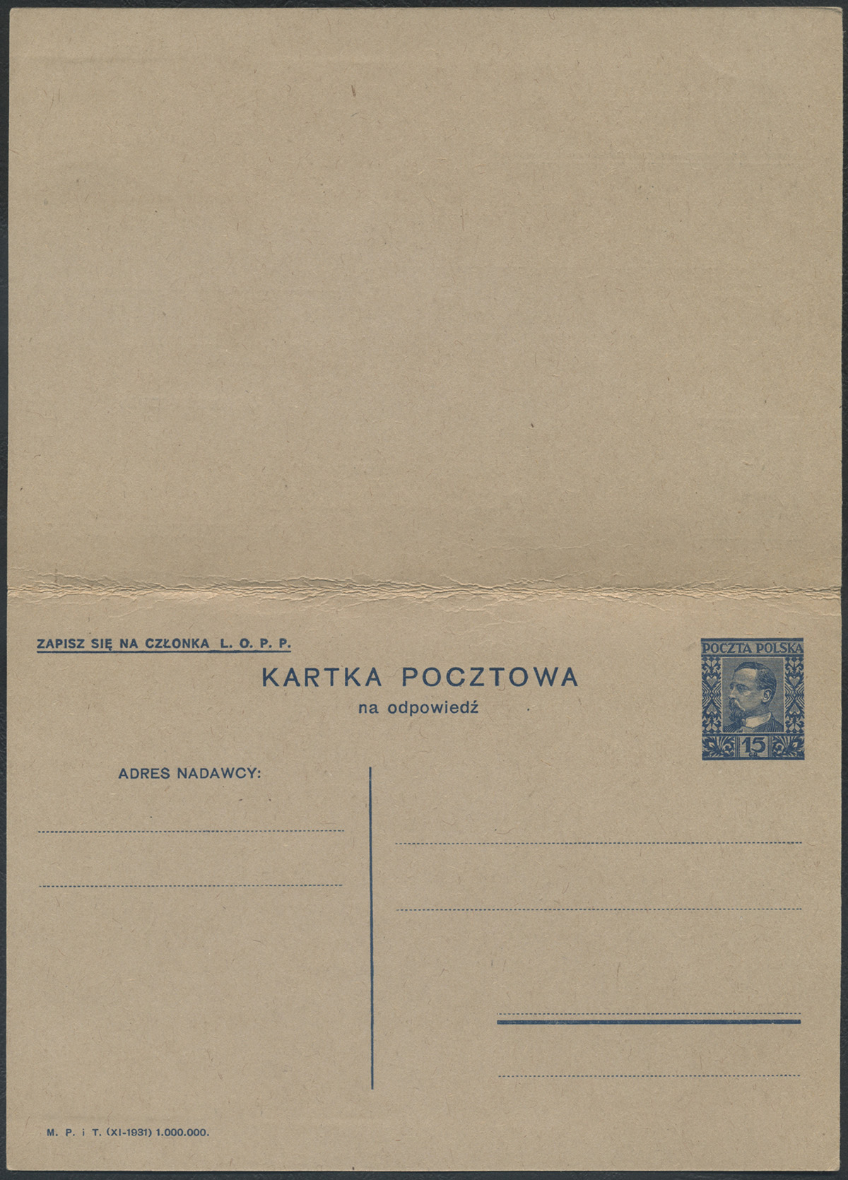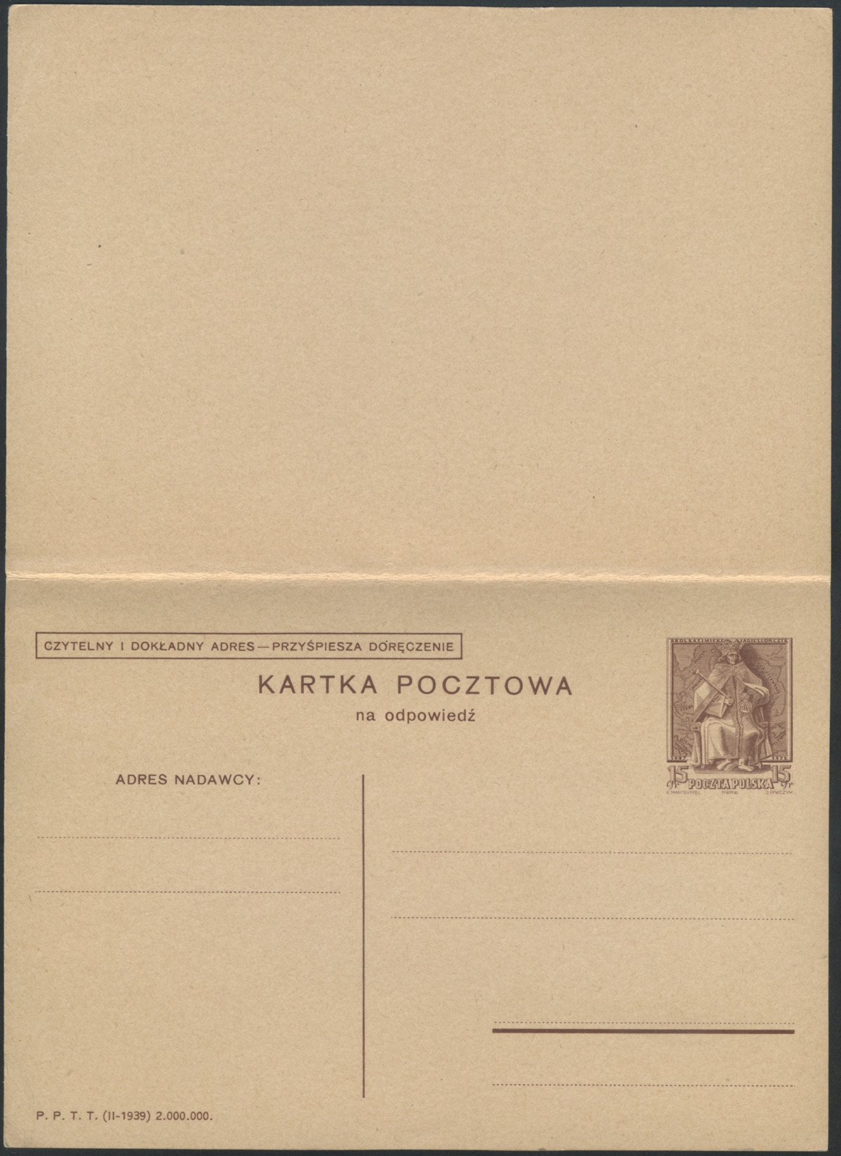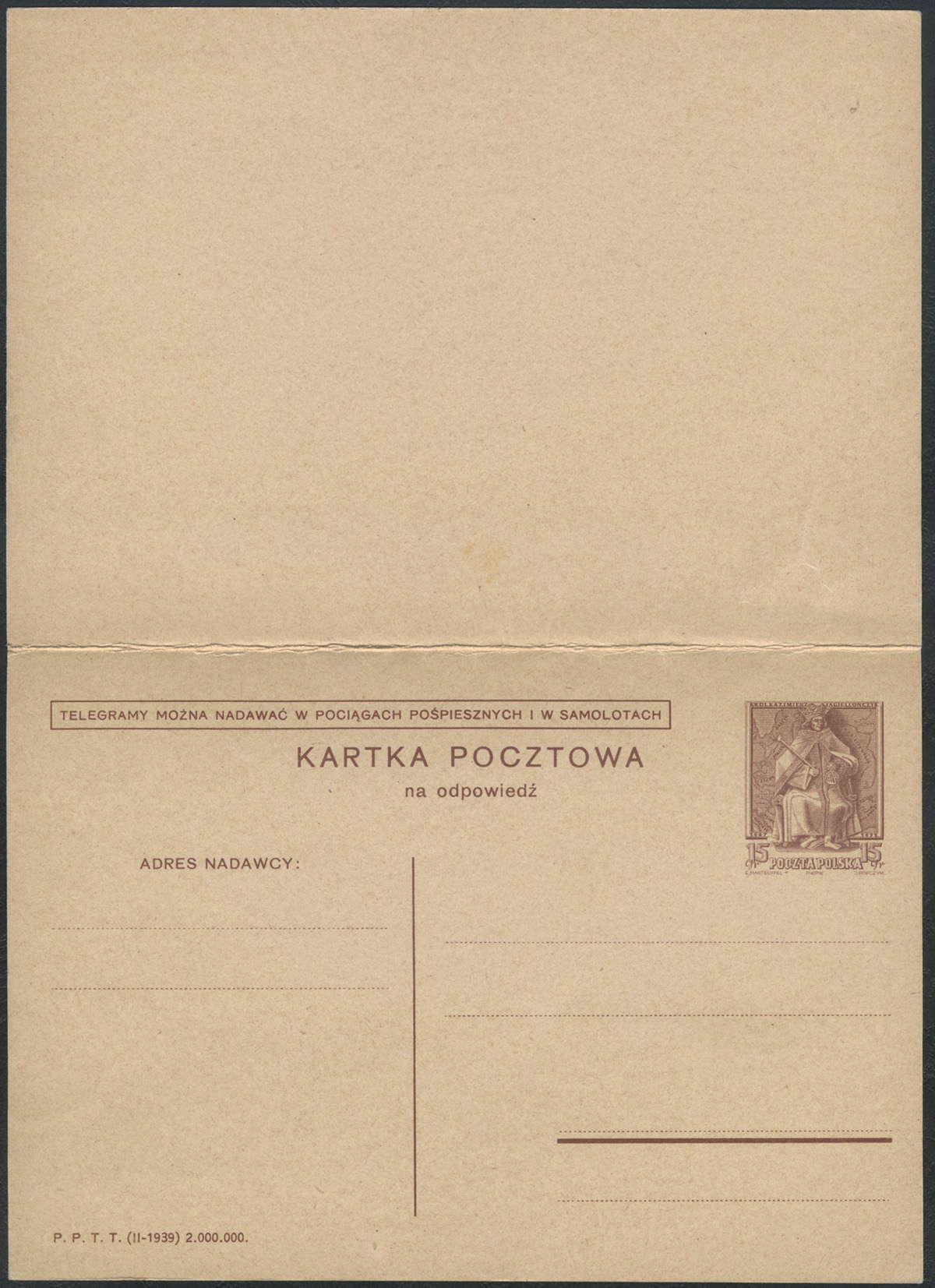 1938 król Kazimierz Jagiellończyk, podwójna całostka z opłaconą odpowiedzią z hasłem propagandowym 15+16. | Fi.Cp82 |