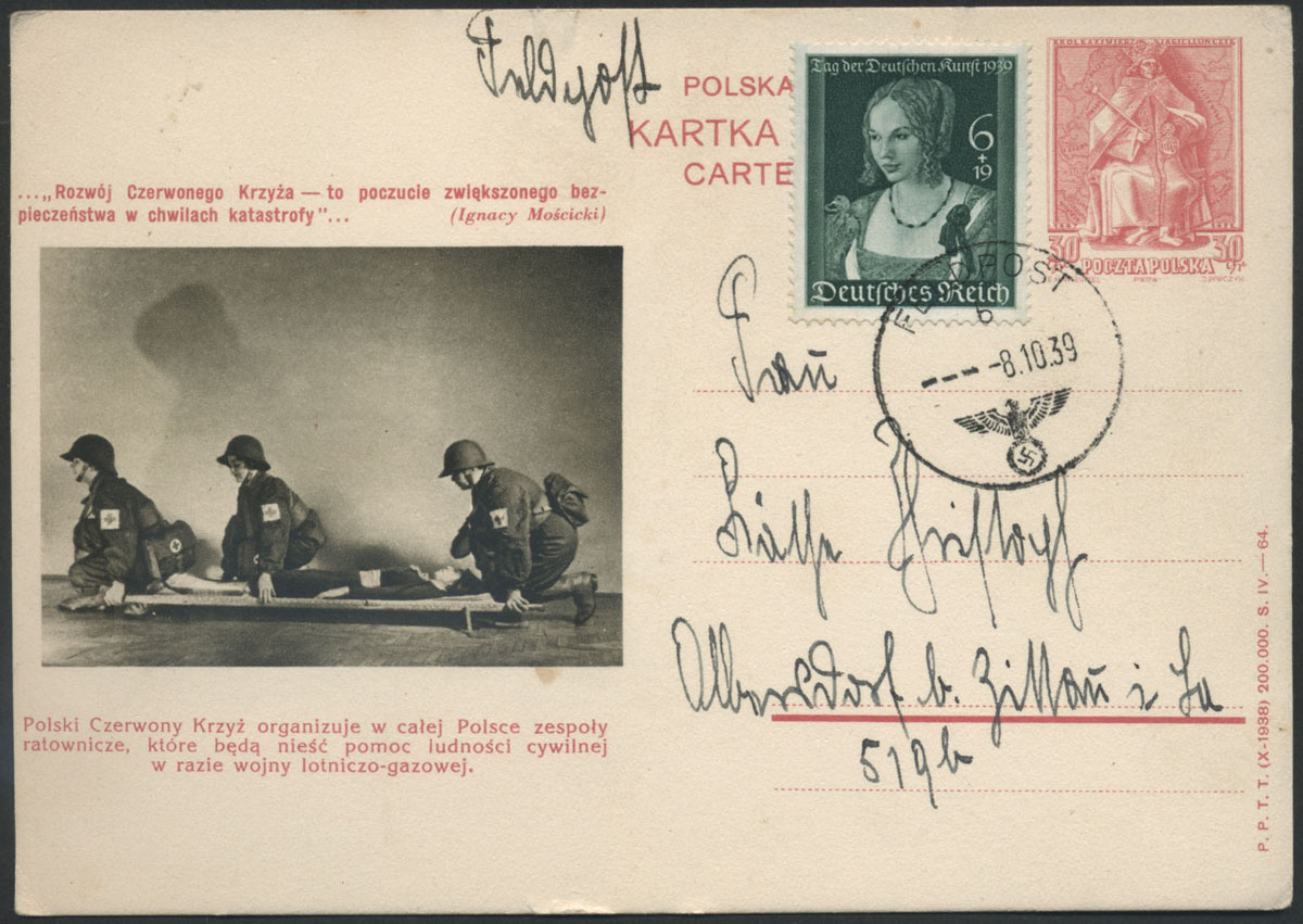 1938 król Kazimierz Jagiellończyk, całostka z ilustracją 64 - zespół ratowniczy Polskiego Czerwonego Krzyża, całostka użyta jako formularz niemieckiej poczty polowej nadany 8.10.39 do Niemiec. | Fi.Cp87 |