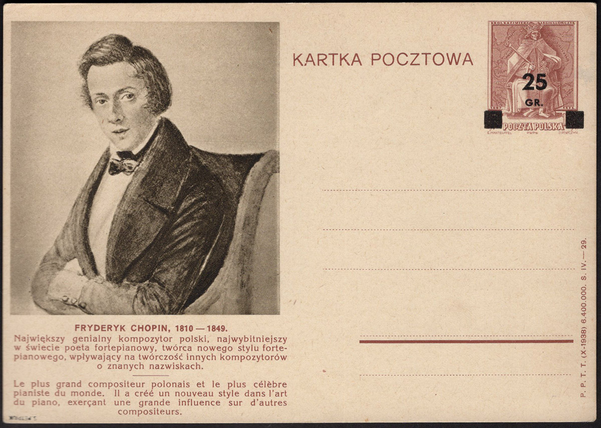 1944 wydanie prowizoryczne, całostka z ilustracją 29 - Fryderyk Chopin, cienki typ nadruku I, gwarancja Petriuk. | Fi.Cp89I |