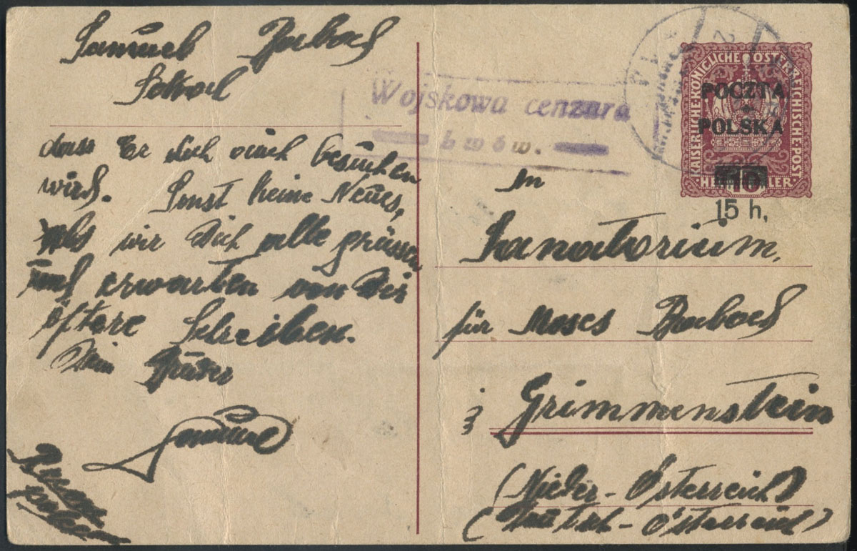 1919 wydanie krakowskie, kartka polecona wysłana z Lwowa do Austrii, stempel cenzury krakowskiej K2, nadruk typ 32. | Fi.Cp16Ix |
