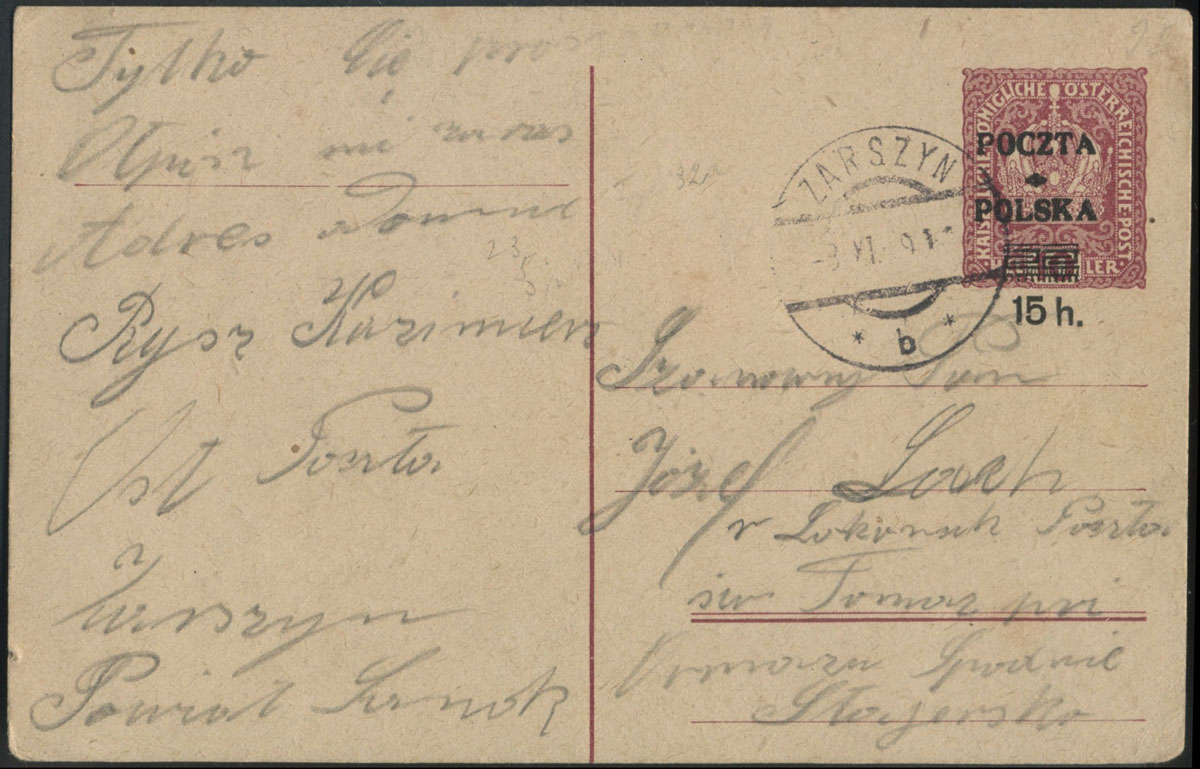1919 wydanie krakowskie, całostka z nadrukiem typ 58 z obiegu pocztowego z Zarszyna. | Fi.Cp16IIx |