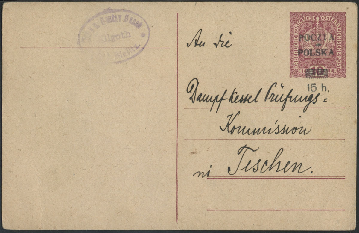1919 wydanie krakowskie, całostka z nadrukiem typ 47 z obiegu pocztowego z Trzyńca. | Fi.Cp16IIx |