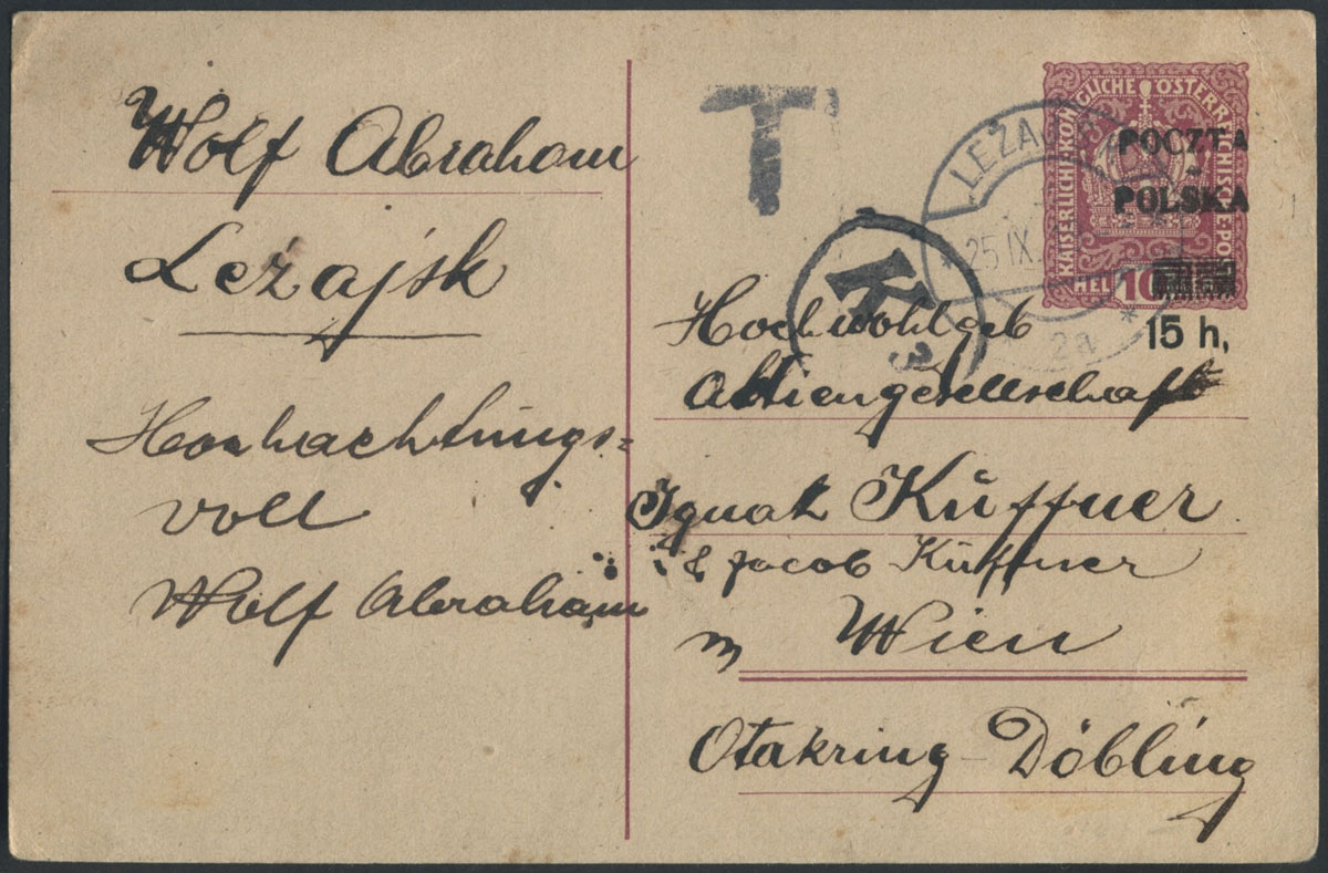 1919 wydanie krakowskie, całostka z nadrukiem typ 70 z obiegu pocztowego z Leżajska. | Fi.Cp16IIx |