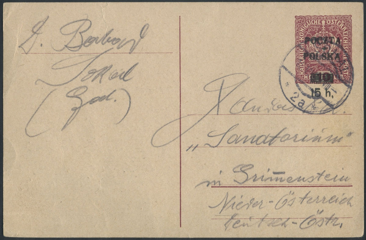 1919 wydanie krakowskie, kartka z Cieszyna 11.III.20 do Wiednia, nadruk typ 98, bardzo późne użycie całostki Cp16 z końca pierwszego kwartału 1920 roku. | Fi.Cp16IIx |