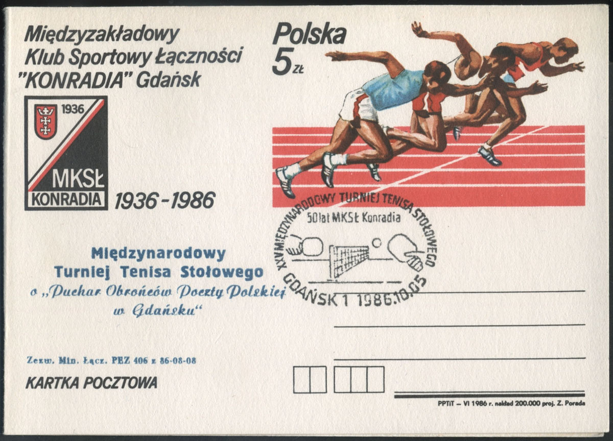 1986 karnet z dodrukiem z okazji Międzynarodowego Turnieju tenisa Stołowego w Gdańsku. | Fi.Cp928K |