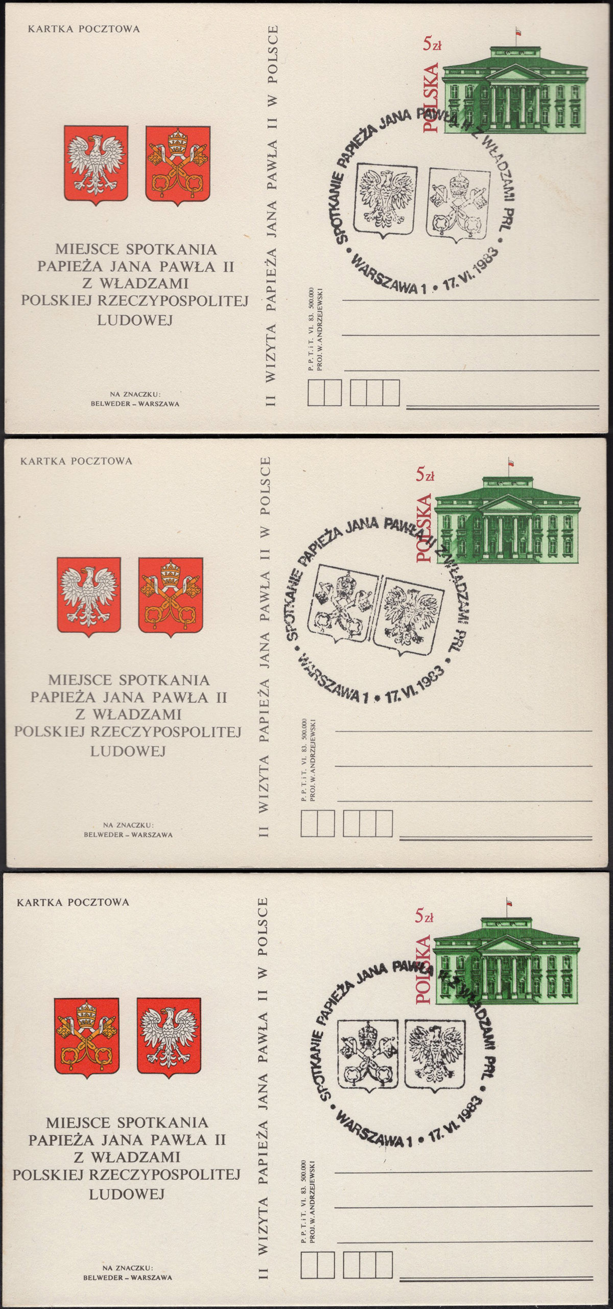 1983 wizyta Jana Pawła II w Polsce, dwie całostki z nieprawidłową kolejnością godła, najpierw Polski i następnie Watykanu; z datownikiem okolicznościowym z tym samym błędem i druga ze skorygowanym, trzecia całostka poprawna dla porównania. | Fi.Cp830a, b |