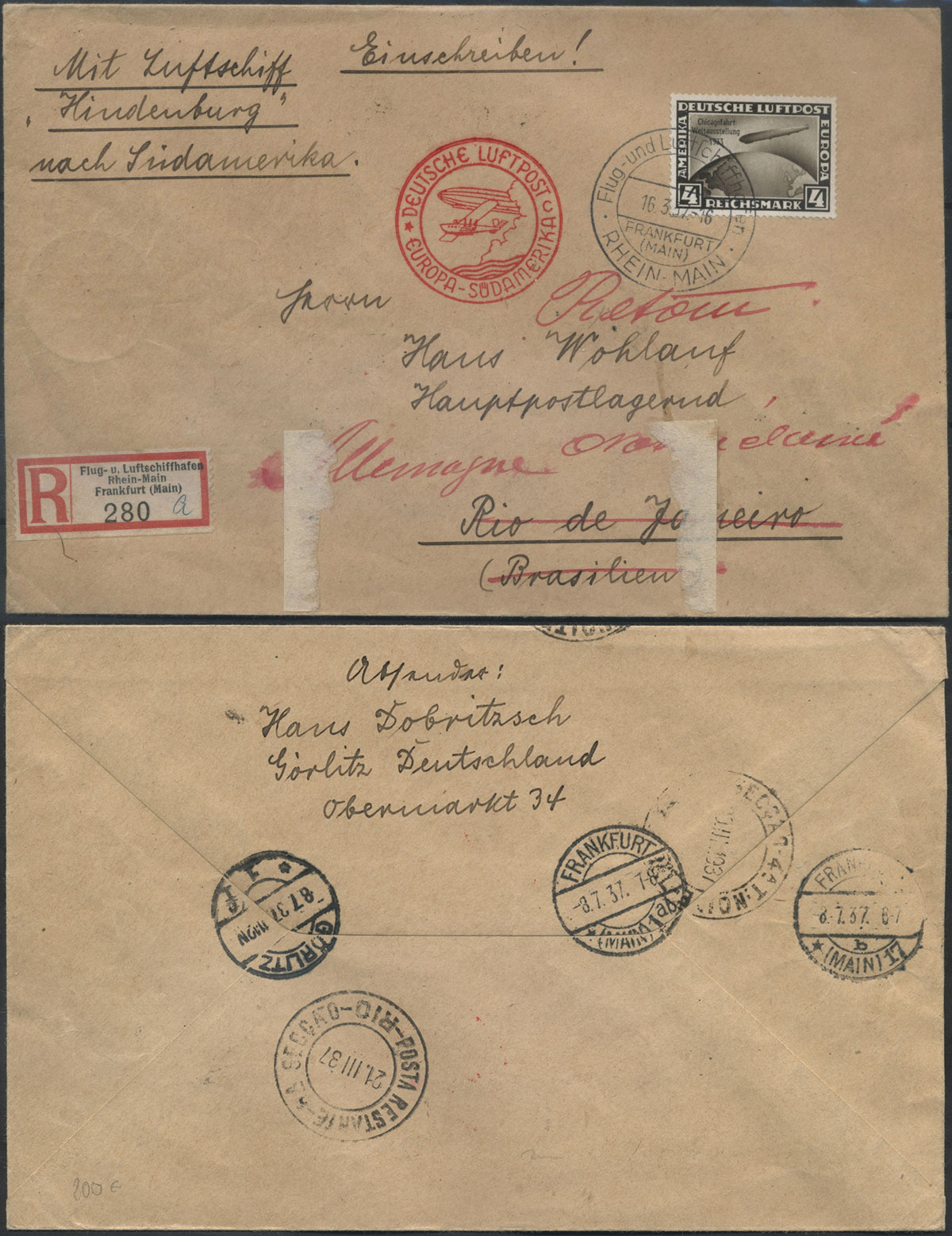1937 LZ 129 Hindenburg, list nadany z Frankfurtu 16.03.37 do Rio de Janeiro, czerwony stempelek lotniczy "DEUTSCHE LUFTPOST EUROPA-SÜDAMERIKA", na odwrocie stemple tranzytowe i odbiorcze. | |