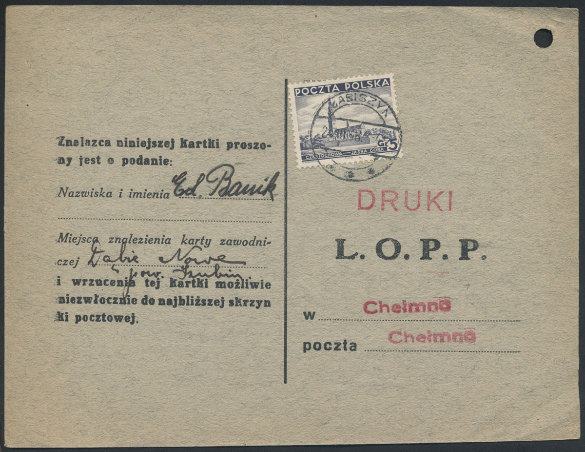 1938 kartka z nadana z Dziełmian z zawodów poczty balonikowej L.O.P.P. w Chełmnie, z instrukcją dla znalazcy do odesłania do organizatora lotu drogą pocztową, zachowało się około 10 kartek przesłanych balonikami. | Fi.28 |