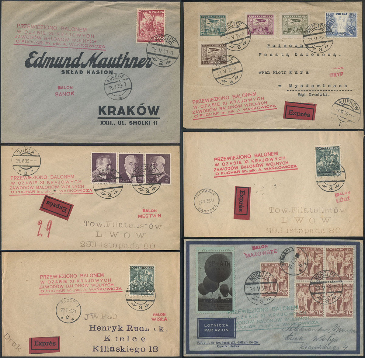 1939 XI Krajowe Zawody Balonów Wolnych o Puchar Przechodni im. A.Wańkowicza w Mościcach, 6 listów przesłanych różnymi balonami. | Fi.29e, f, i, j, k, l |