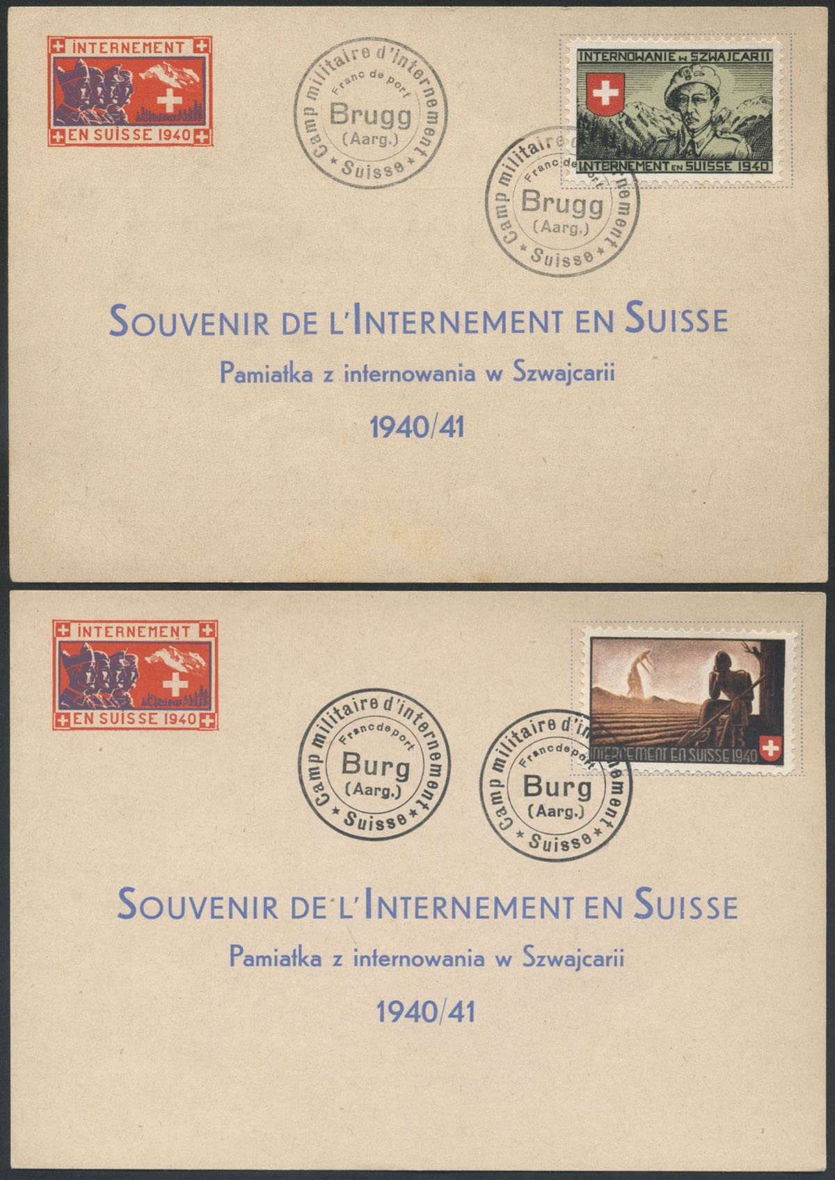 1940 Internowanie w Szwajcarii - formularze "Pamiątka z internowania w Szwajcarii", pierwsza kartka będąca zarazem losem na loterię na rzecz internowanych Polaków z drukiem loteryjnym na odwrocie, ostemplowane w obozie Burg, bardzo dobry stan zachowania.